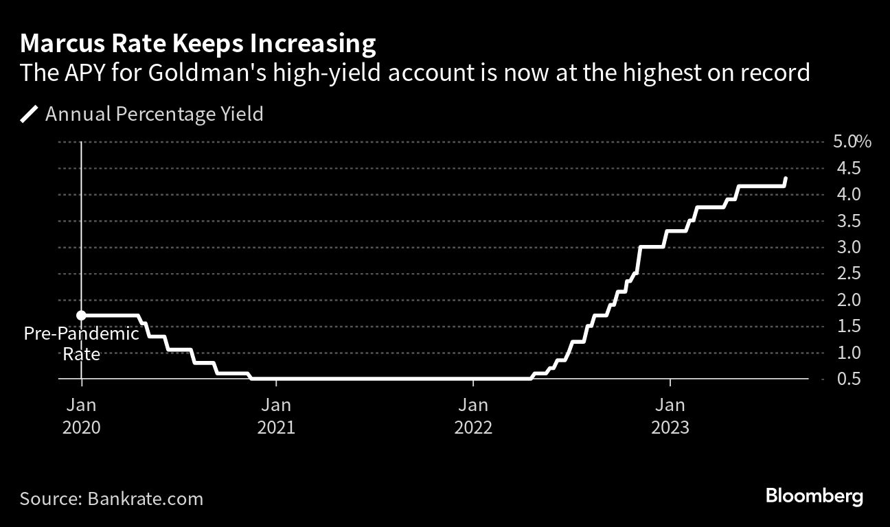 Marcus by Goldman Sachs Group Inc. recently raised the interest rate on its high-yield accounts to an all-time high of 4.3%, following the latest hike in the Federal Reserve's key benchmark rate. At the end of the June, about 39 million US homes had a mortgage rate below 4.375%, according to Black Knight, a mortgage technology and data provider. That was more than 73% of the outstanding mortgages in the US.
