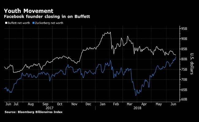 Facebook Inc. co-founder Mark Zuckerberg came within a whisker of leapfrogging Warren Buffett as the world's third-richest person Wednesday. Zuckerberg, more than a half-century younger than the Berkshire Hathaway Inc. chairman, is now worth $81.6 billion, gaining $8.8 billion this year as Facebook shook off a data-privacy crisis that caused its stock to tumble 18 percent. Its rebound from a low of $152.22 on March 27 to close at a record $202 narrowed the gap with Warren Buffett to $29 million, according to the Bloomberg Billionaires Index.