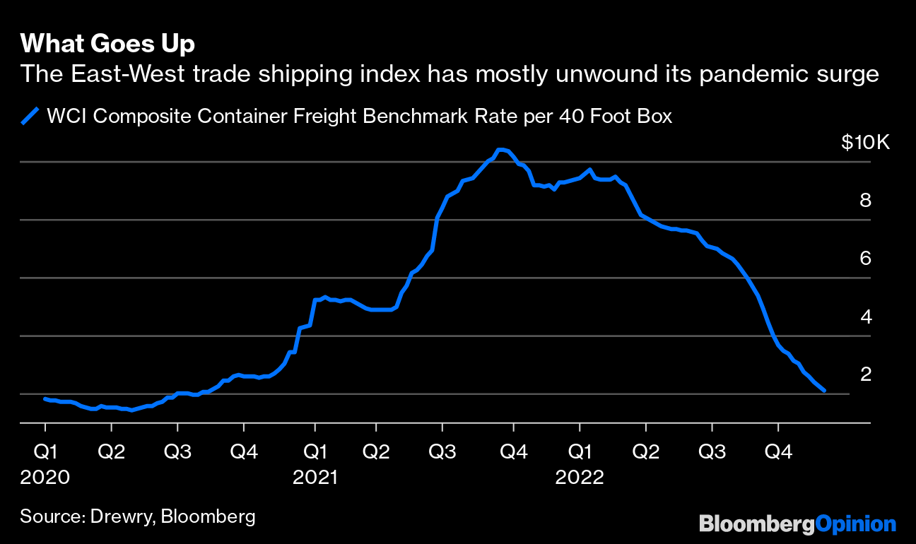The cost of moving goods around the world has nearly returned to pre-pandemic levels, having fallen 80% from its peak in September 2021. This offers a welcome logistical respite to supply chains and the accompanying inflation pressure.