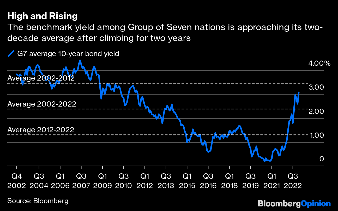 Overly-generous monetary and fiscal stimulus during the pandemic has led to runaway inflation — kryptonite for bonds. US yields, the global benchmark, have blazed the trail towards significantly higher levels. The consensus forecast among economists surveyed by Bloomberg is for 10-year Treasuries to be at 3.5% by the end of 2023, little changed from the current level of about 3.85%. That strikes us as unlikely; either team transitory wins the day and yields decline, or increased friction in global trade keeps consumer prices and bond yields rising.
