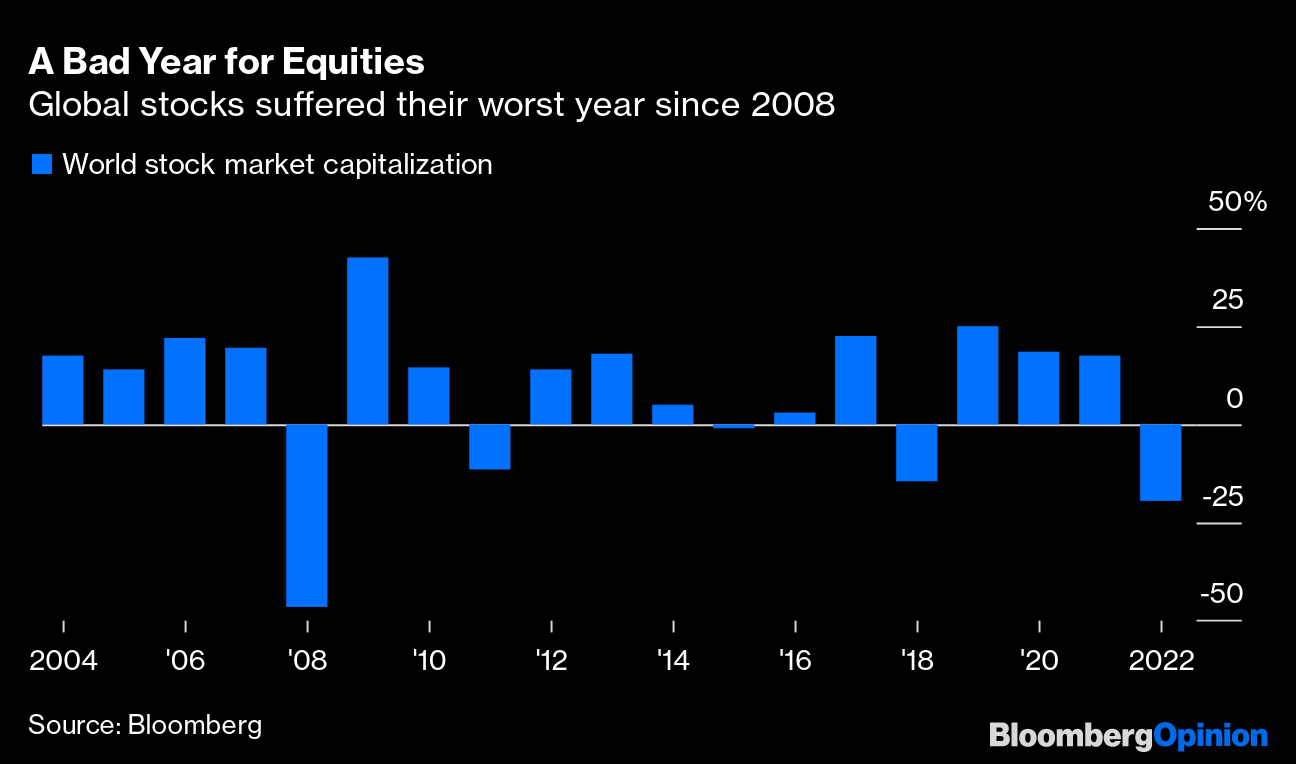 (Bloomberg Opinion) -- Investors had a vexing time last year. Rampant inflation was met by central banks racing to hike official interest rates, trashing returns on almost every asset class with the exceptions of gold and other commodities. The key for financial markets in the coming year will be whether policy makers can engineer a soft landing for the global economy, or whether recession becomes endemic. Given how badly the guardians of monetary stability misjudged the post-pandemic environment, we're skeptical of their ability to concoct a Goldilocks economy. Too much tightening risks serving up cold economic porridge as growth becomes moribund.