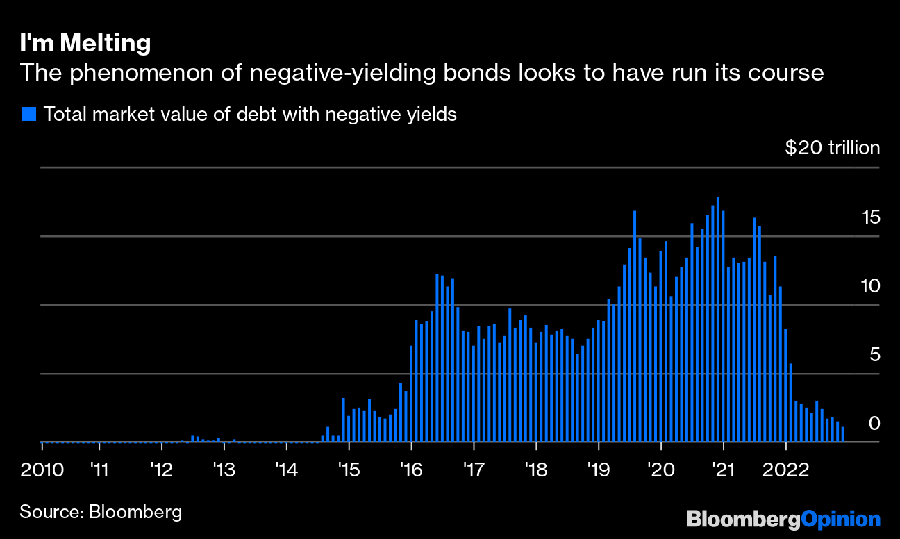 The universe of negative-yielding bonds has withered as the interest-rate hiking bandwagon picked up speed. Its zenith in early 2021 saw more than $18 trillion of debt offering sub-zero rates. It is now a much more modest $1.1 trillion, as the financial world returns to something more akin to normality as the Alice-Through-the-Looking-Glass era of getting paid to borrow finally ends.