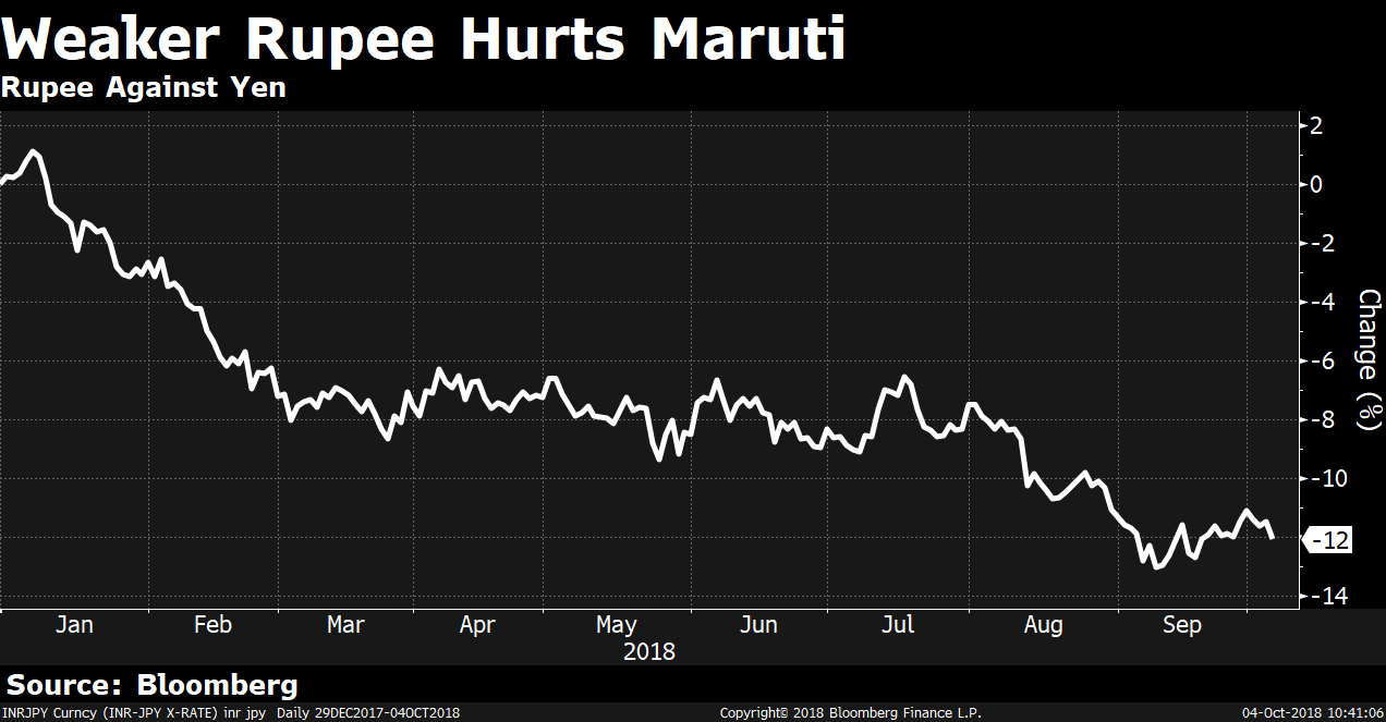 The Japanese yen has appreciated around 12 percent the rupee after the Indian unit slid against the U.S. dollar. According to Deutsche Bank, the earnings-per-share of Maruti drops 0.7 percent for every 1 percent increase in the yen against the rupee.