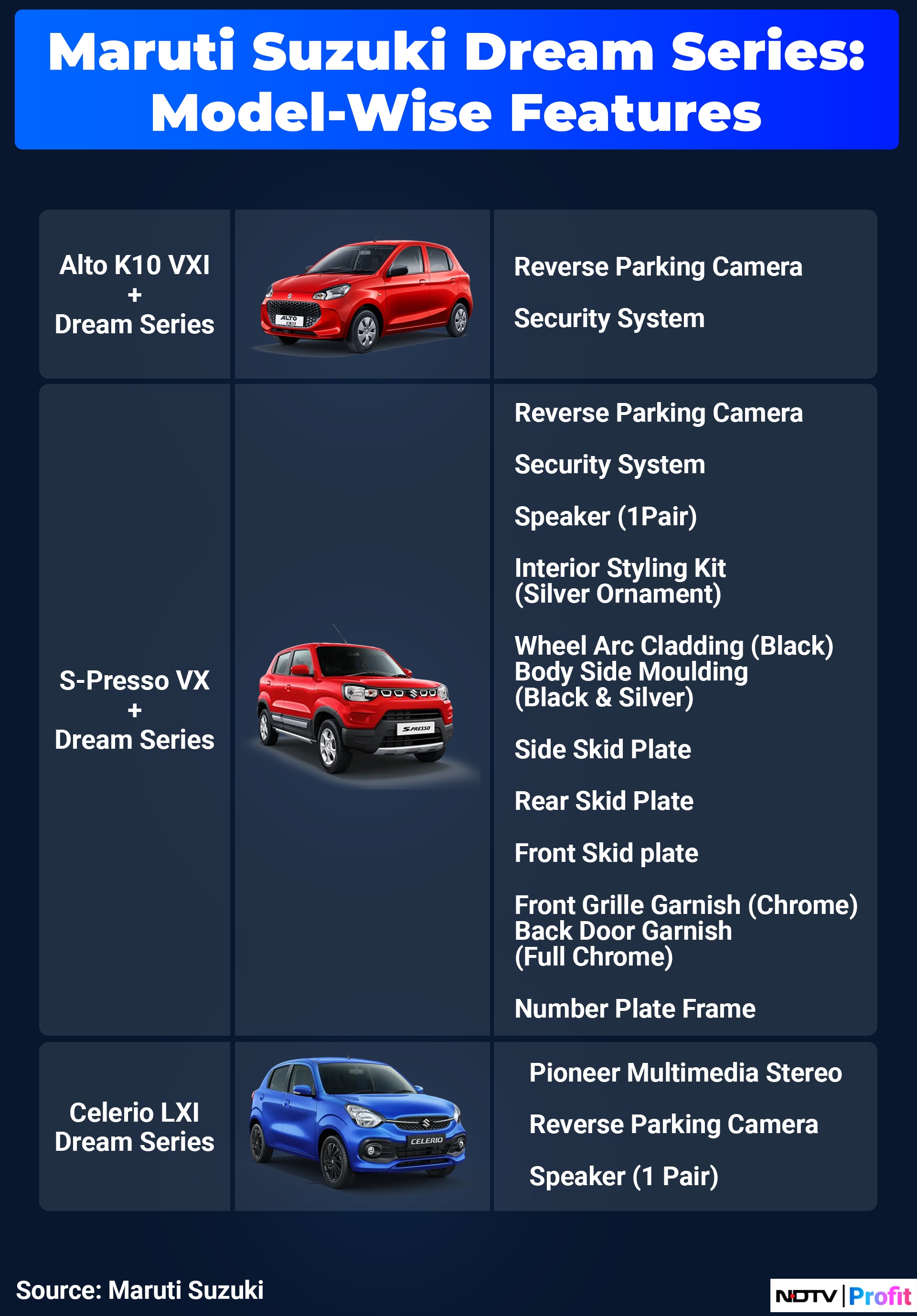 The so-called 'Dream Series' includes three of Maruti Suzuki India Ltd.'s smallest cars—Alto K10, Celerio and S-Presso—with additional features seen as essential by buyers, according to a company statement. These limited-edition cars—available for the month of June 2024 only—are priced at Rs 4.99 lakh. The pricing is such since the calculation of registration costs changes for four-wheelers priced Rs 5 lakh and above.