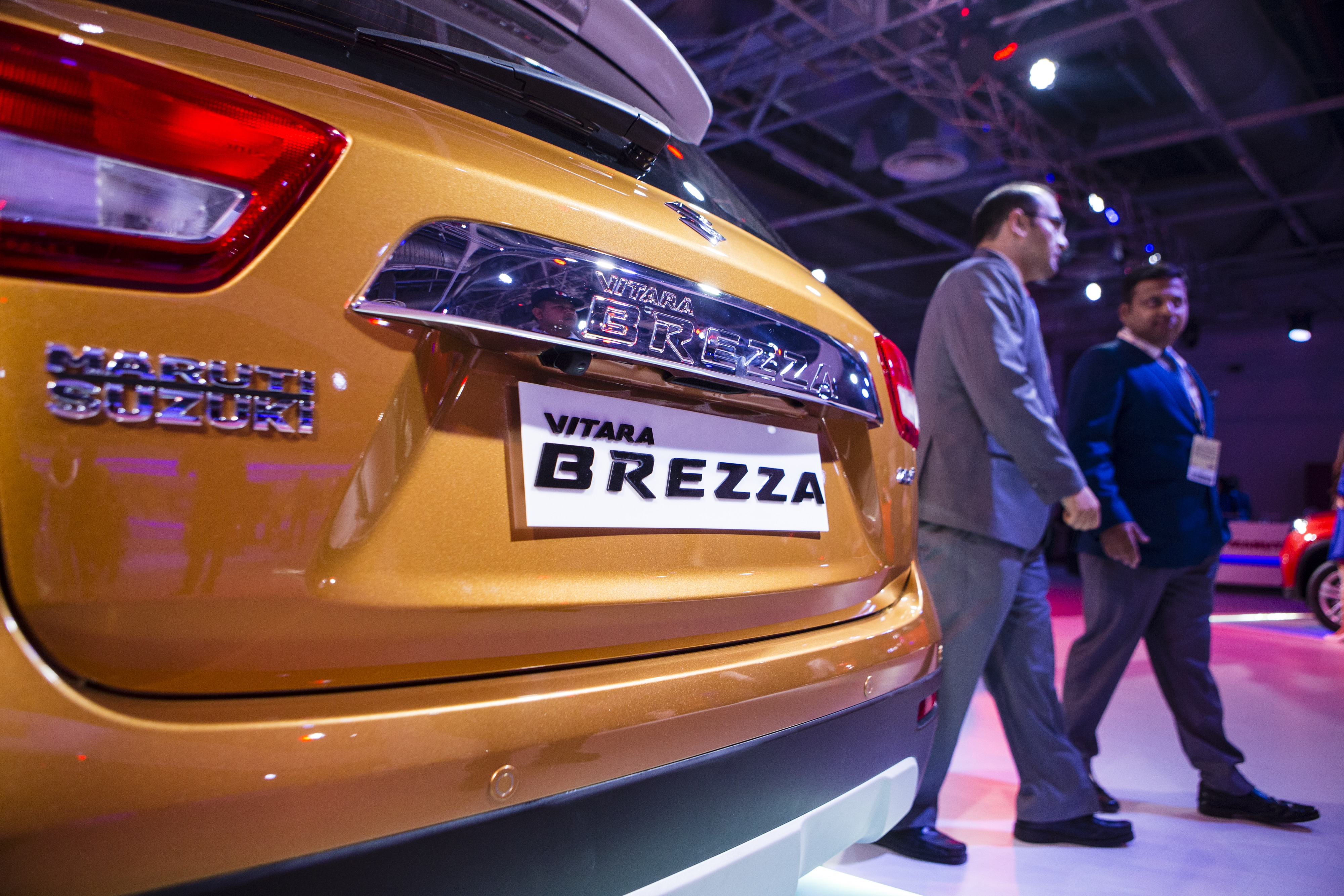 Attendees walk past the Maruti Suzuki India Vitara Brezza compact SUV on display at the Auto Expo in Noida, Uttar Pradesh, India. (Photographer: Prashanth Vishwanathan/Bloomberg)
