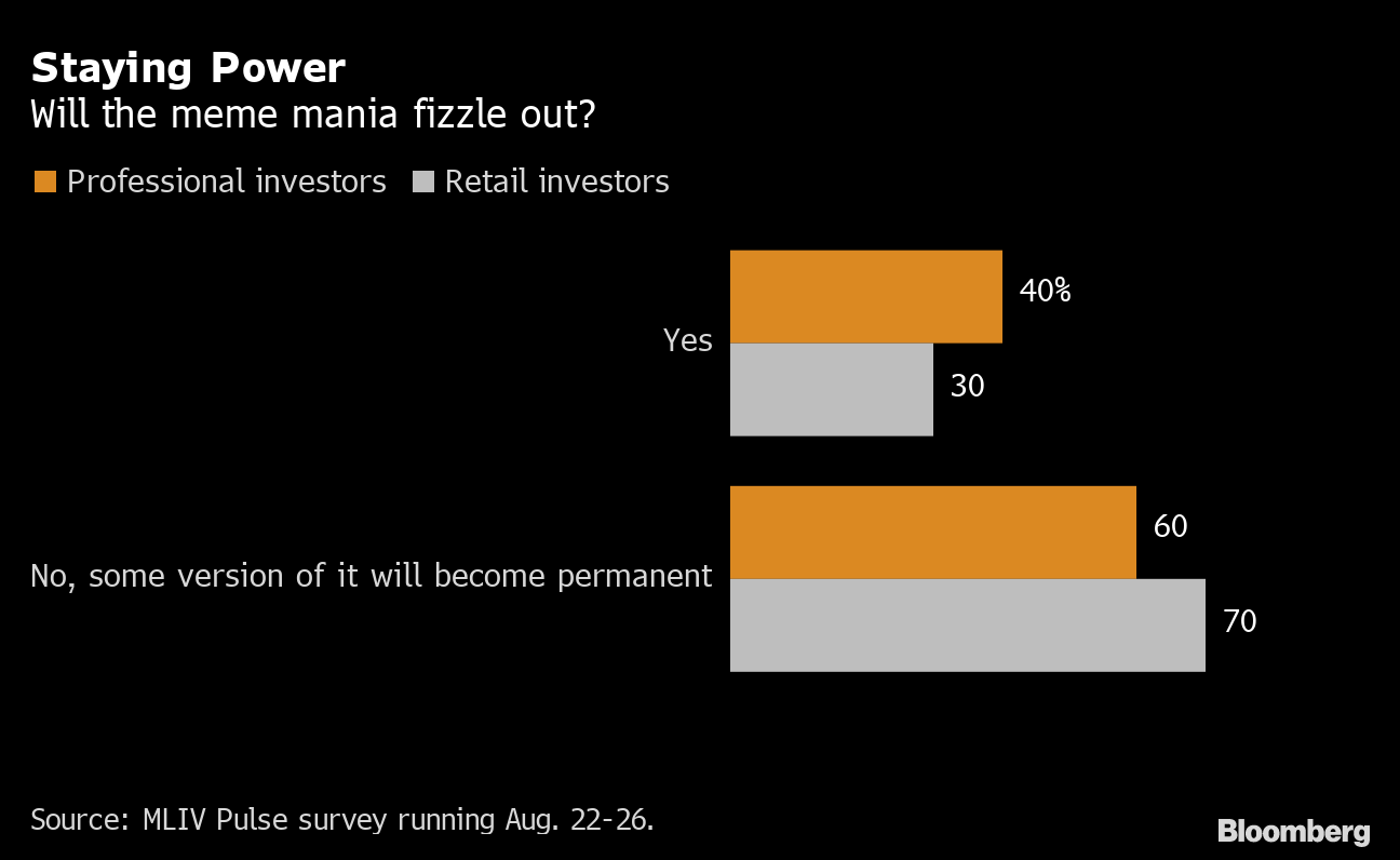 It had all the elements of a flash-in-the-pan trend, especially with the speculative excesses giving way to a bear-market beating. Yet Wall Street professionals and individual investors think it will become a permanent part of the market landscape: Nearly two-thirds of the 522 respondents in the latest MLIV Pulse survey expect some version of the meme stock mania to stick around.