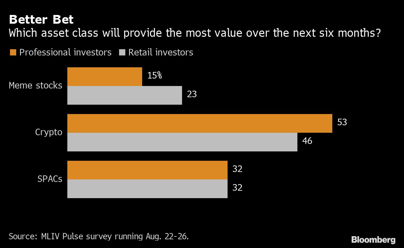When asked whether cryptocurrencies, meme stocks or so-called blank check companies known as SPACs would provide the best value over the next six months, 51% of respondents chose crypto and 32% SPACs. Only 17% favored meme stocks.