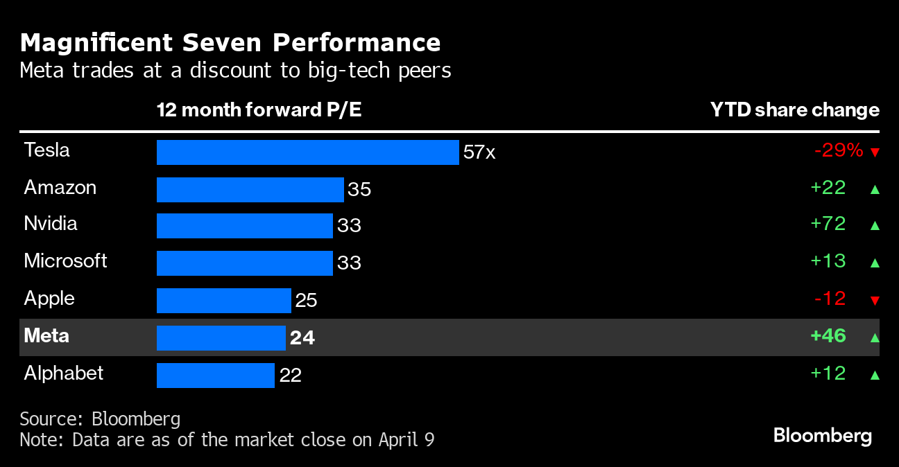 (Bloomberg) -- Meta Platforms Inc.'s record-breaking, artificial intelligence-fueled rally has added $1 trillion in market value since its darkest days of 2022, and yet by some perspectives it's still trading at a discount.ย