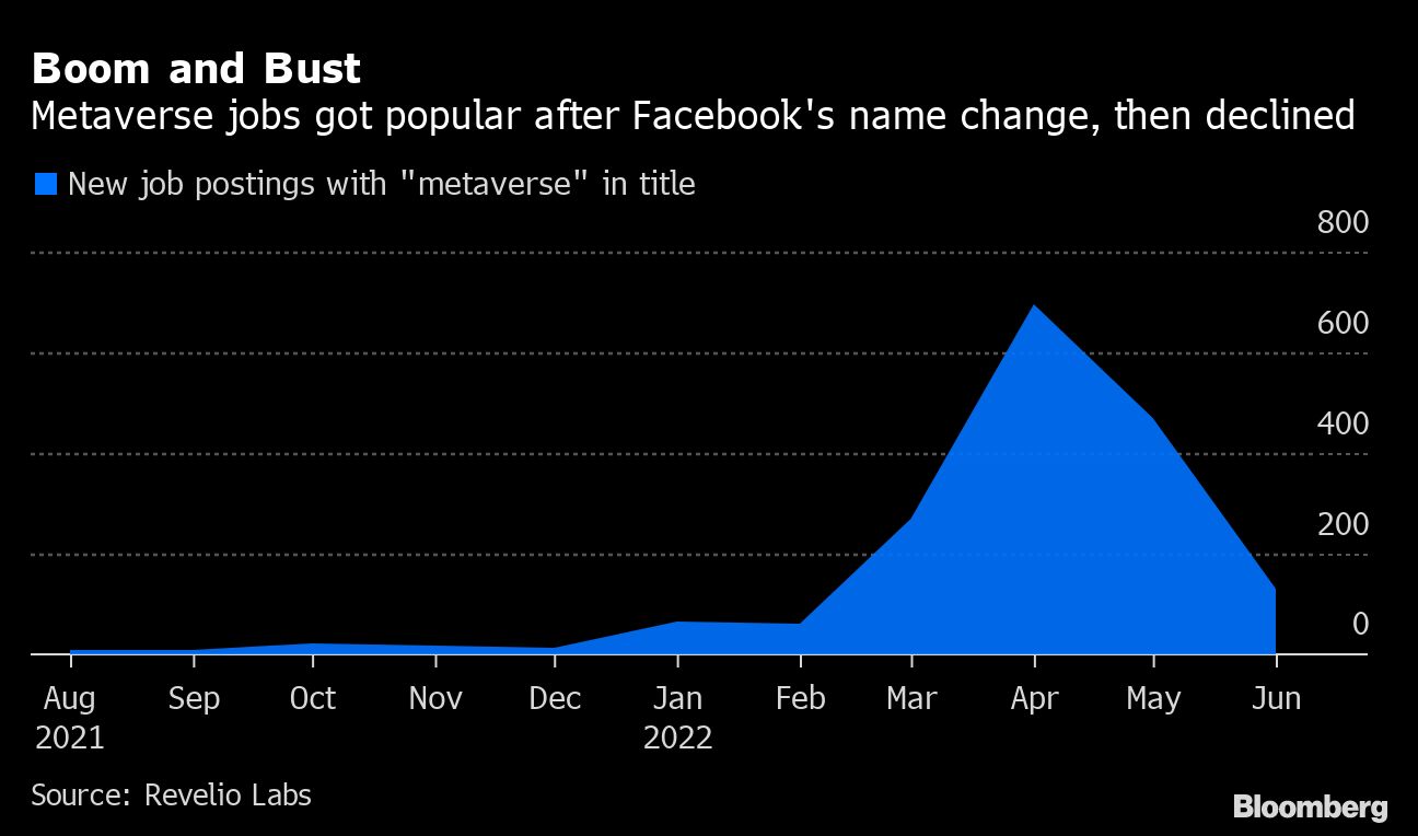 New monthly job postings across all industries with “metaverse” in the title declined 81% between April and June, Revelio found, after surging in the months following Facebook's rebranding last fall. The dropoff coincides with a broader pullback across the tech sector, which has prompted layoffs and hiring freezes, leaving workers from the Bay Area to Bangalore increasingly rattled.