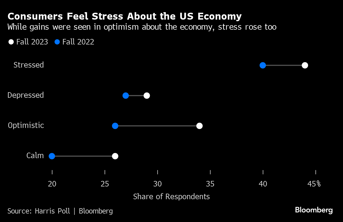 (Bloomberg) -- Despite roaring growth and a resilient job market, more middle-class Americans are worried about the state of the economy than a year ago, a Harris Poll for Bloomberg News has found.