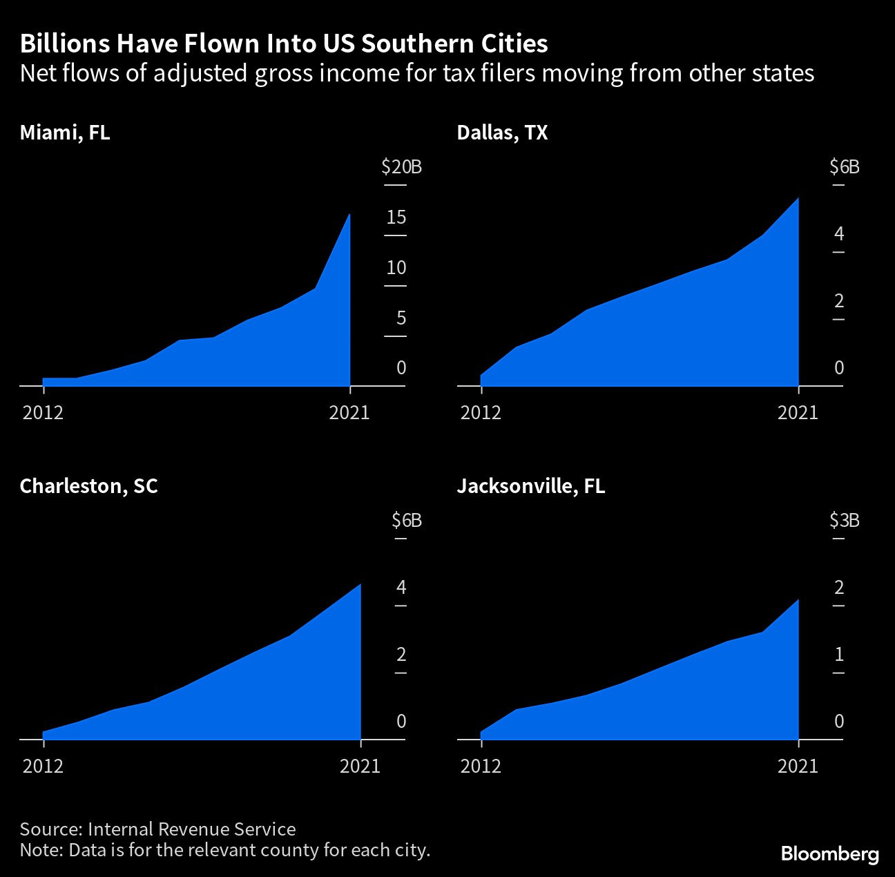A flood of transplants helped steer about $100 billion in new income to the Southeast in 2020 and 2021 alone, while the Northeast bled out about $60 billion, based on an analysis of recently published Internal Revenue Service data.