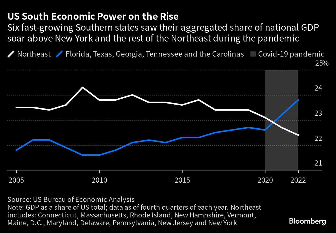 The numbers tell the story. For the first time, six fast-growing states in the South — Florida, Texas, Georgia, the Carolinas and Tennessee — are contributing more to the national GDP than the Northeast, with its Washington-New York-Boston corridor, in government figures going back to the 1990s. The switch happened during the pandemic and shows no signs of reverting.