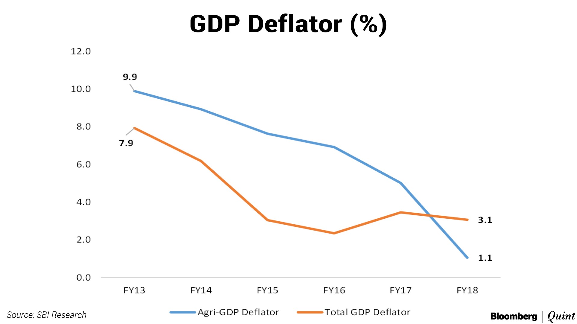 This decline in agri-GDP deflator is an indication of distress and low level of purchasing power in rural/agriculture area. Such a decline also coincides with the inflation targeting regime introduced by RBI from FY13.Soumya Kanti Ghosh, Chief Economist, SBI