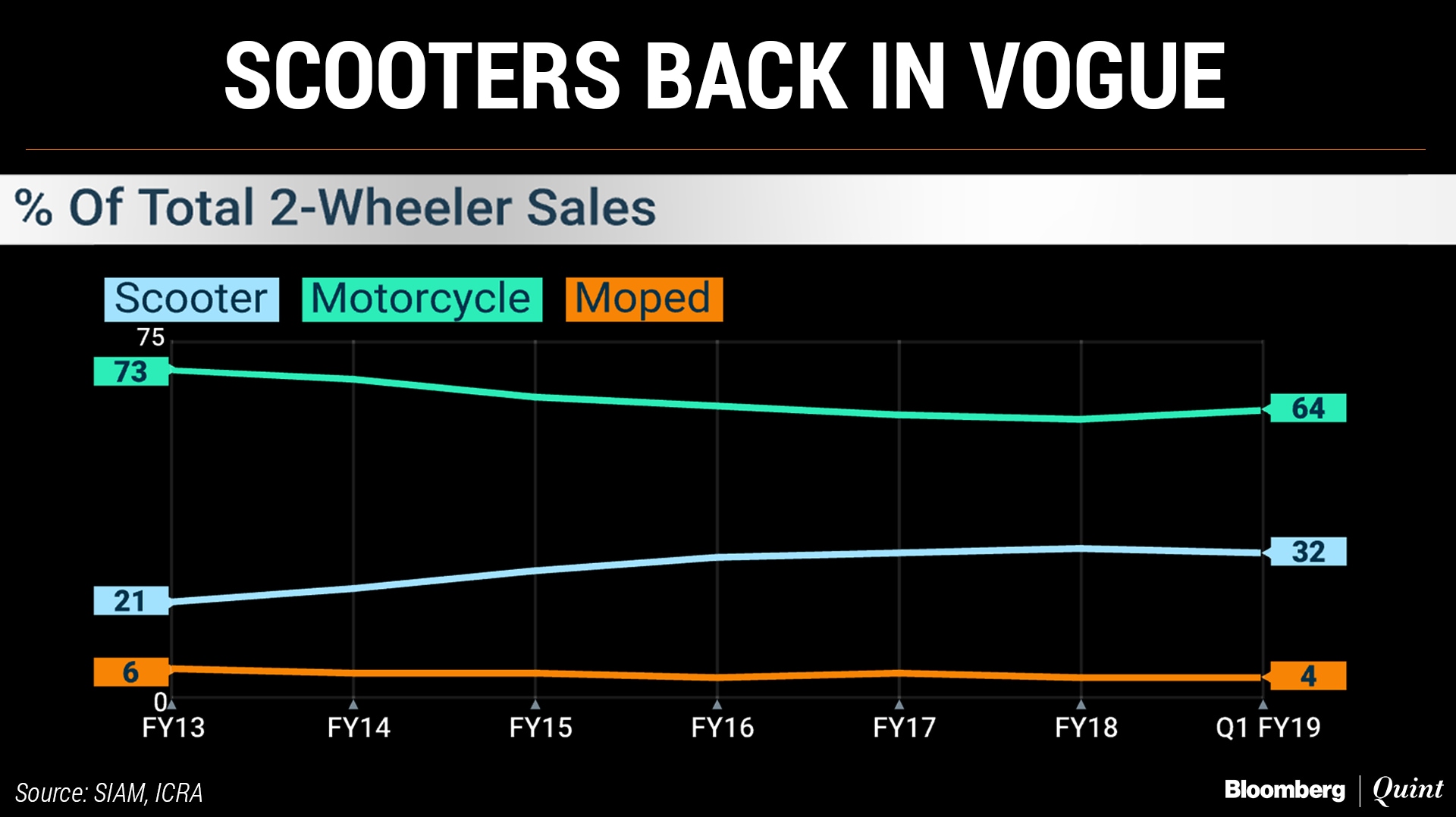 Honda Motorcycles, riding on the success of its Activa, is now the nation's No. 1 scooter maker, contributing 60 percent of the industry's volumes. That helped it wrest market share from both Hero Motocorp and Bajaj Auto in the two-wheeler market, selling 3.1 million units in the year through March 2018.