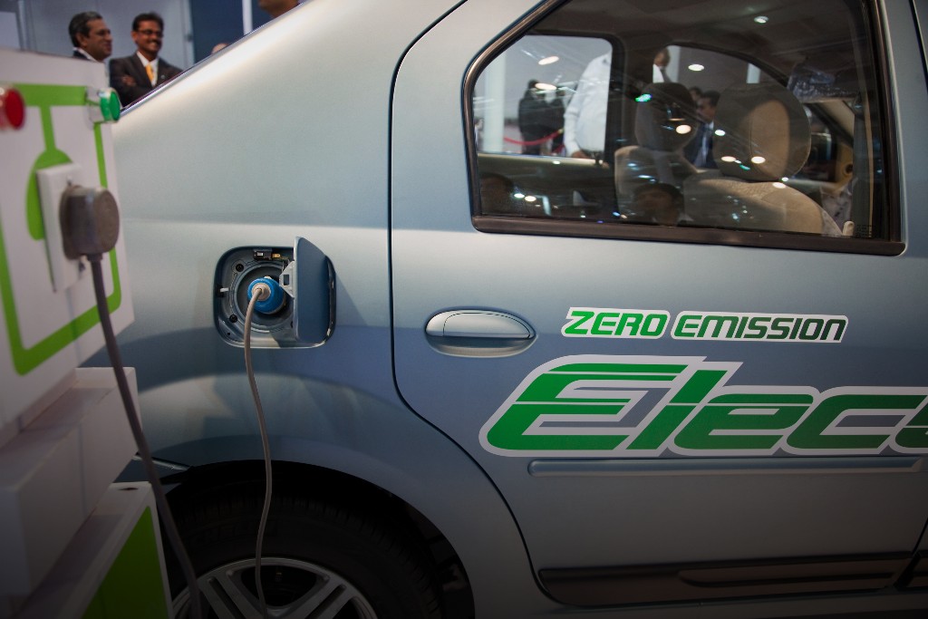 A Mahindra & Mahindra Ltd. Verito electric vehicle is charged at the Auto Expo 2012. (Photographer: Graham Crouch/Bloomberg)
