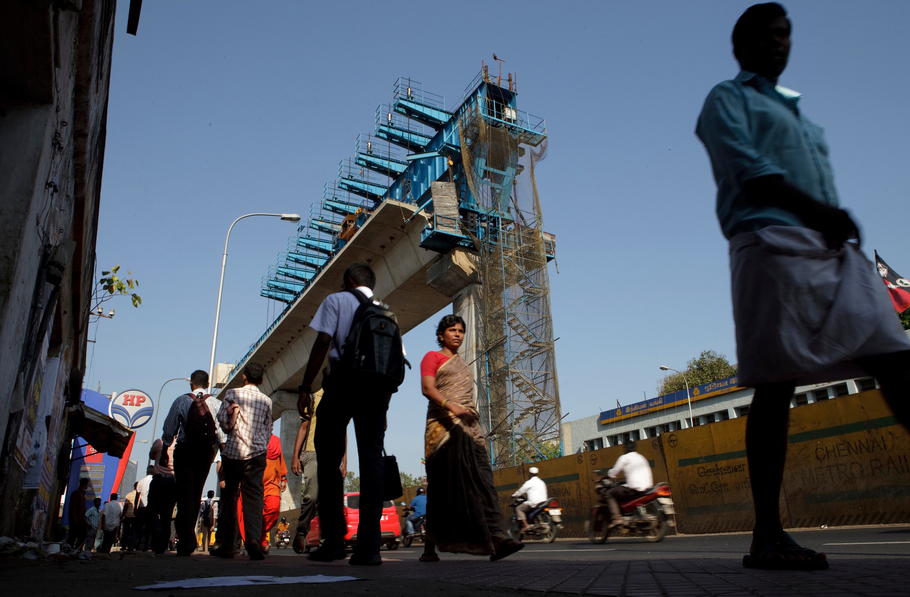Pedestrians walk past a Chennai Metro Rail Ltd. construction in Chennai, India (Photographer: Kuni Takahashi/Bloomberg)