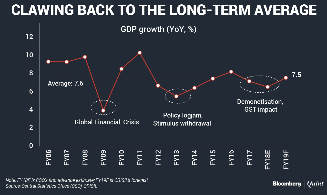 Crisil expects India to grow at 7.5 percent in 2018-19. While that's an improvement over the last two years, it is still lower than the average growth seen in the past 13 years. Besides, it is coming on a weak base in this fiscal.
