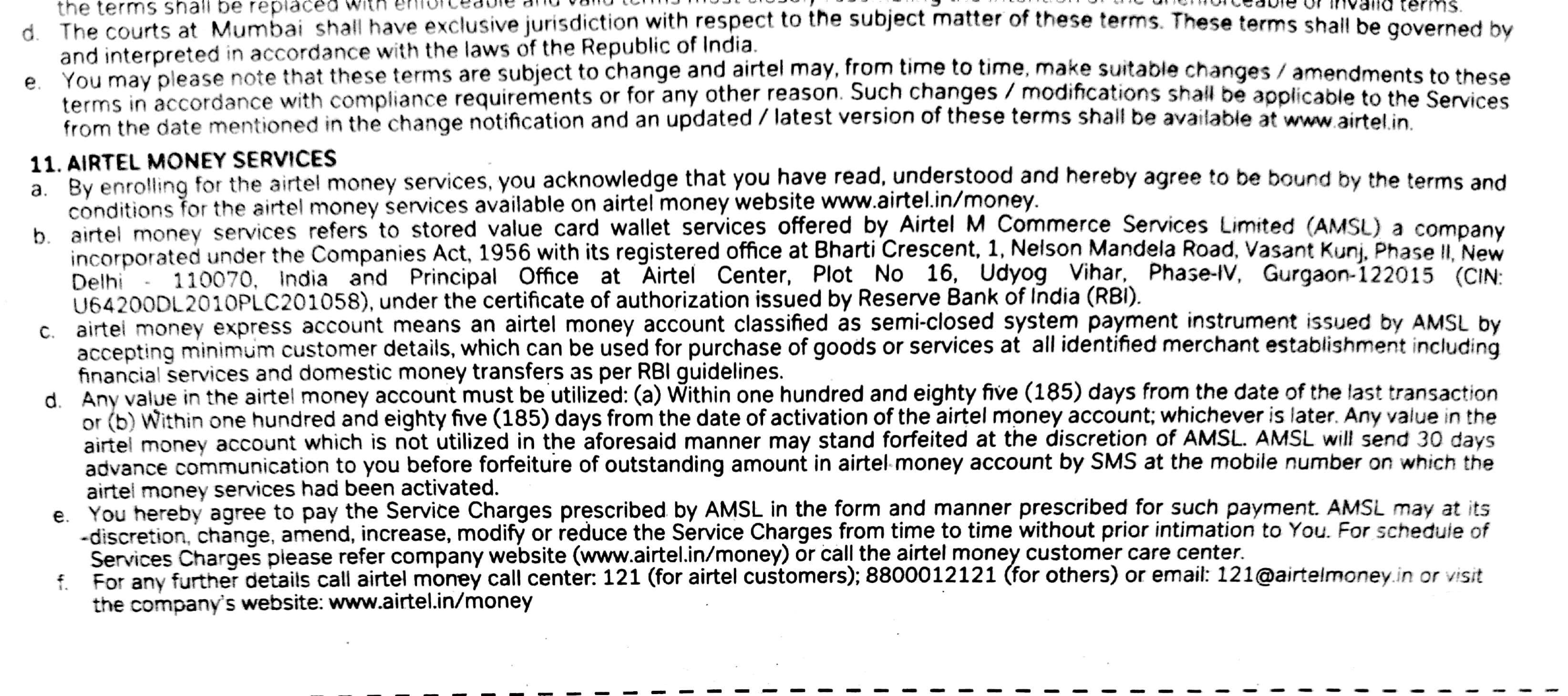 By enrolling for the Airtel Money services, you acknowledge that you have read, understood and hereby agree to be bound by the terms and conditions for the Airtel Money services available on the website www.airtel.in/money.