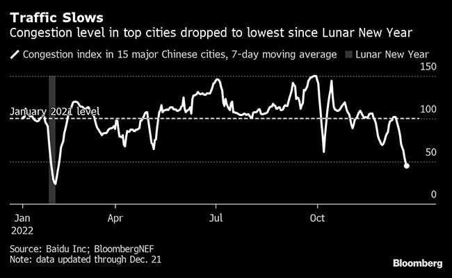 Congestion levels across 15 major cities are 56 per cent below the level in January 2021, the benchmark used in an index compiled by BloombergNEF based on Baidu Inc. traffic data.