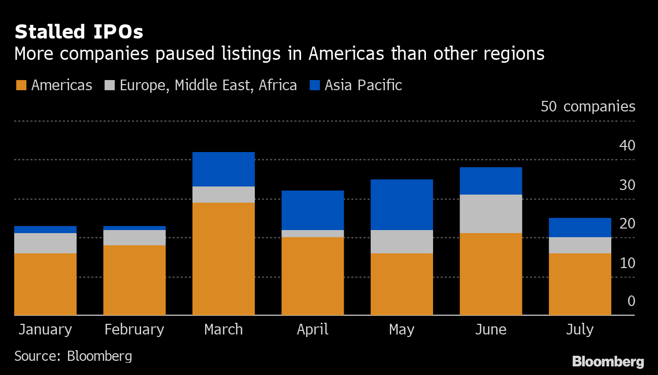 The deals, including initial public offerings, bonds, loans and acquisitions, amount to more than $254 billion. The Americas saw the highest number of transactions being postponed or shelved at 184, which was more than double the tally for other regions, according to data compiled by Bloomberg.
