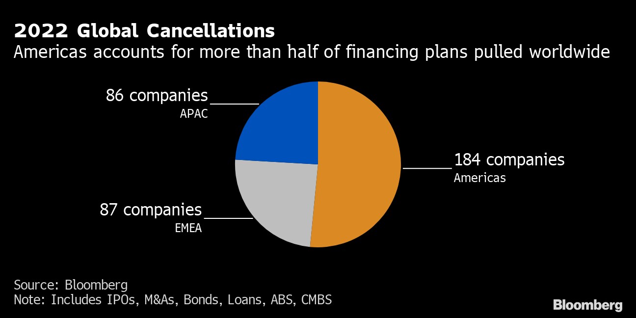 (Bloomberg) -- The number of companies that have delayed or canceled financing plans has soared to at least 358 as the global economy continues to battle inflation and energy shortages.