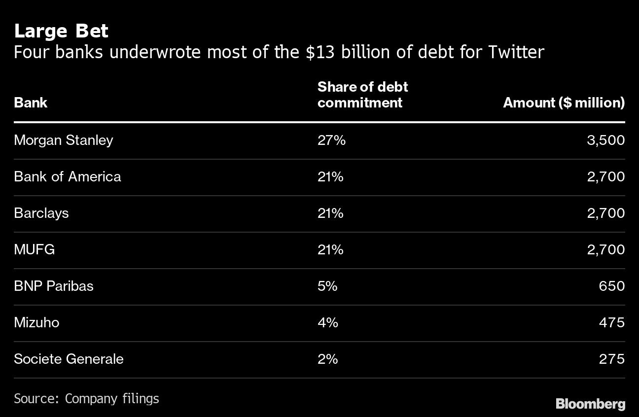 Of the more than $500 million of losses that the banks are estimated to have on the Twitter debt, up to about $400 million stems from the riskiest portion, the unsecured bonds, which have a maximum interest rate for the company of about 11.75%, Bloomberg reported earlier this year. The losses exclude fees the banks would usually earn on the transaction.