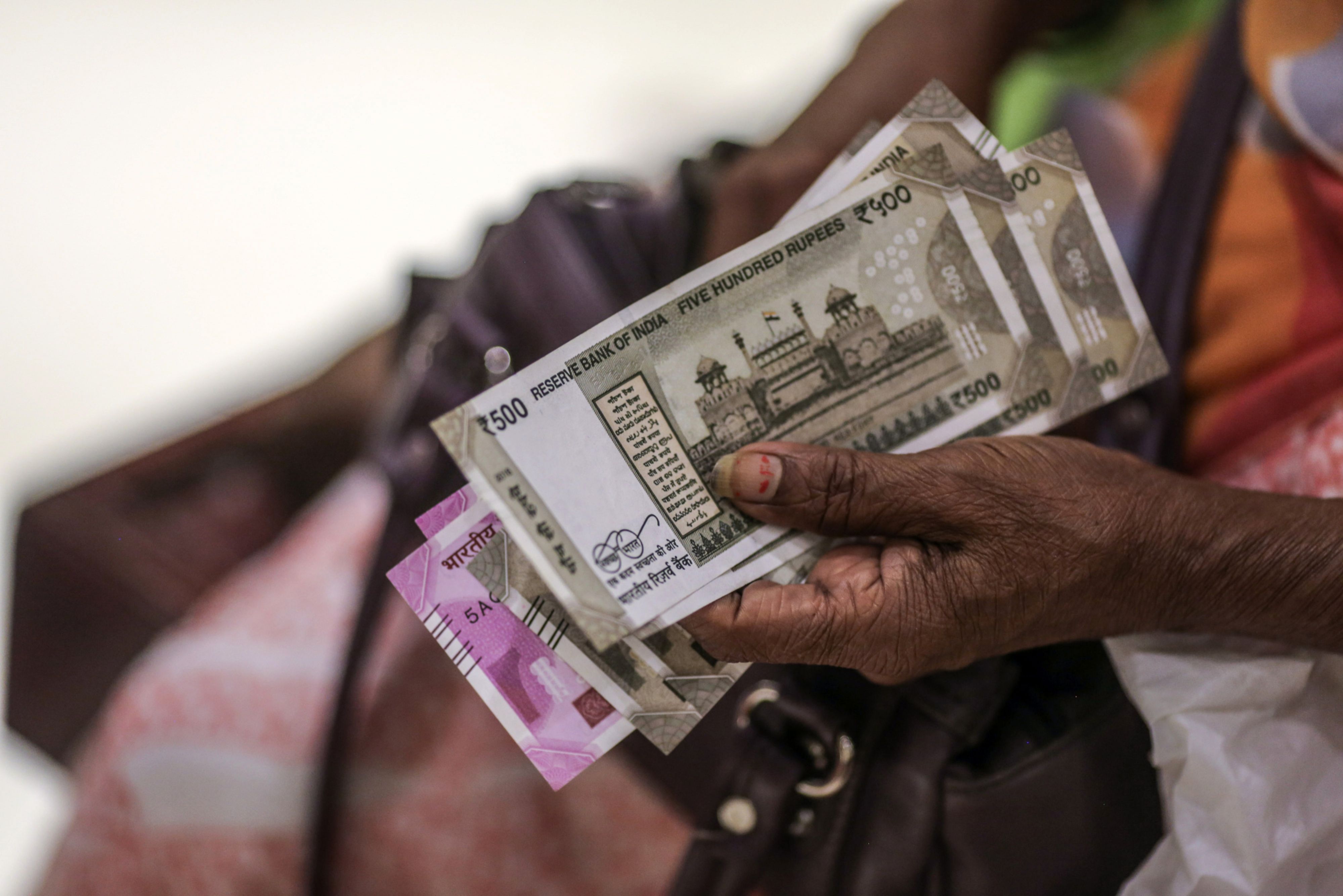 A customer holds Indian rupee banknotes at a store in Pune, India. (Photographer: Dhiraj Singh/Bloomberg)