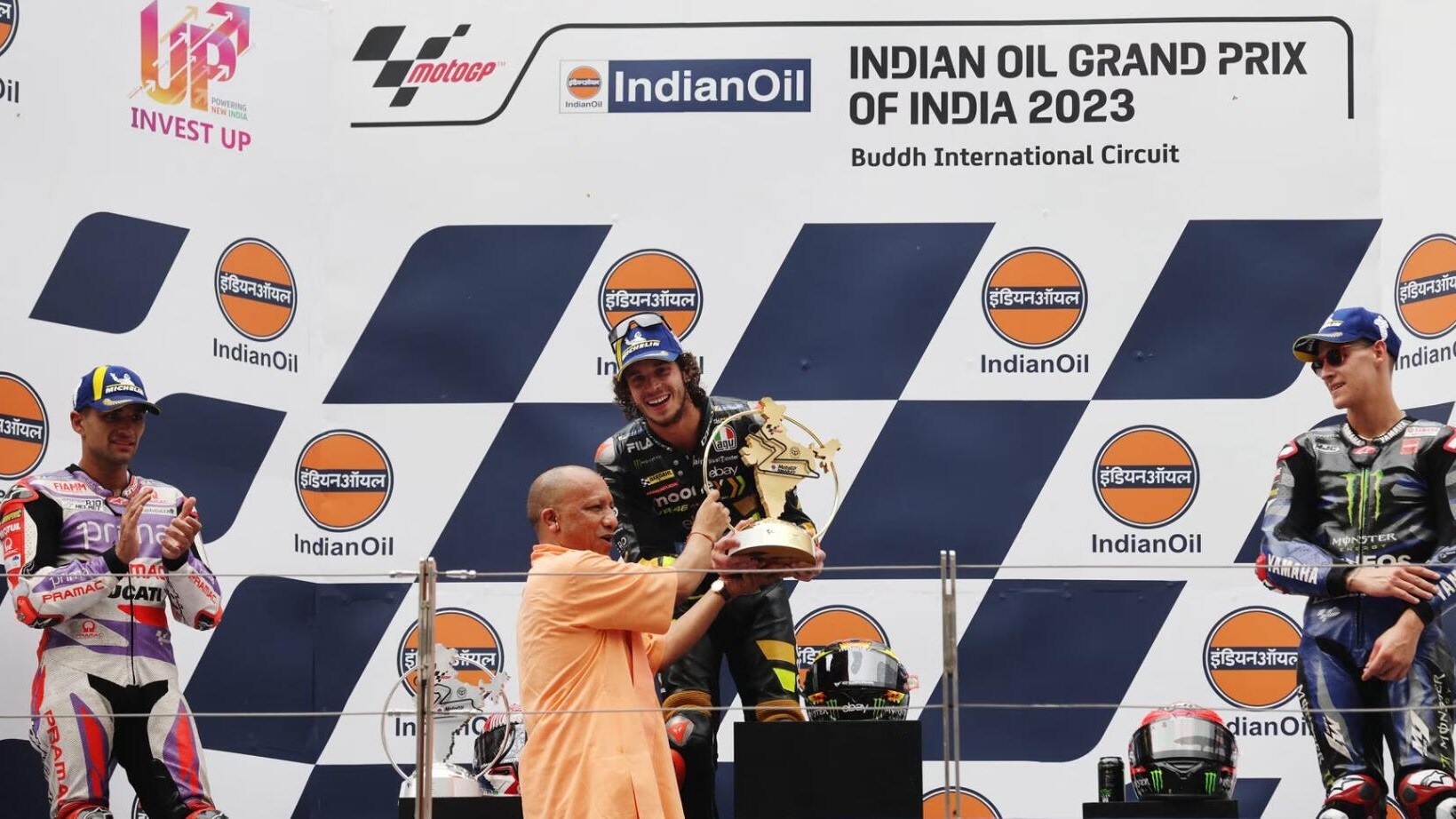 VR46 Racing’s Marco Bezzecchi receives the winner's trophy from Uttar Pradesh Chief Minister Yogi Adityanath in 2023. The UP government has now become a co-promoter of MotoGP Bharat. (Source: Fairstreet Sports)
