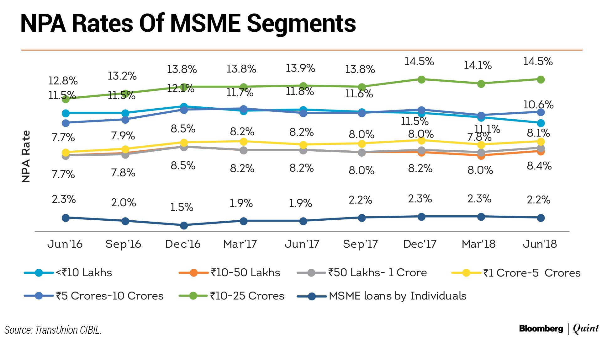 Data from MSME Pulse report released by TransUnion-CIBIL and SIDBI, shows that this segment had NPA ratios in excess of 14 percent as of June 2018. The overall NPA ratio for micro and SME borrowers stood at 8.7 percent and 11.5 percent respectively.