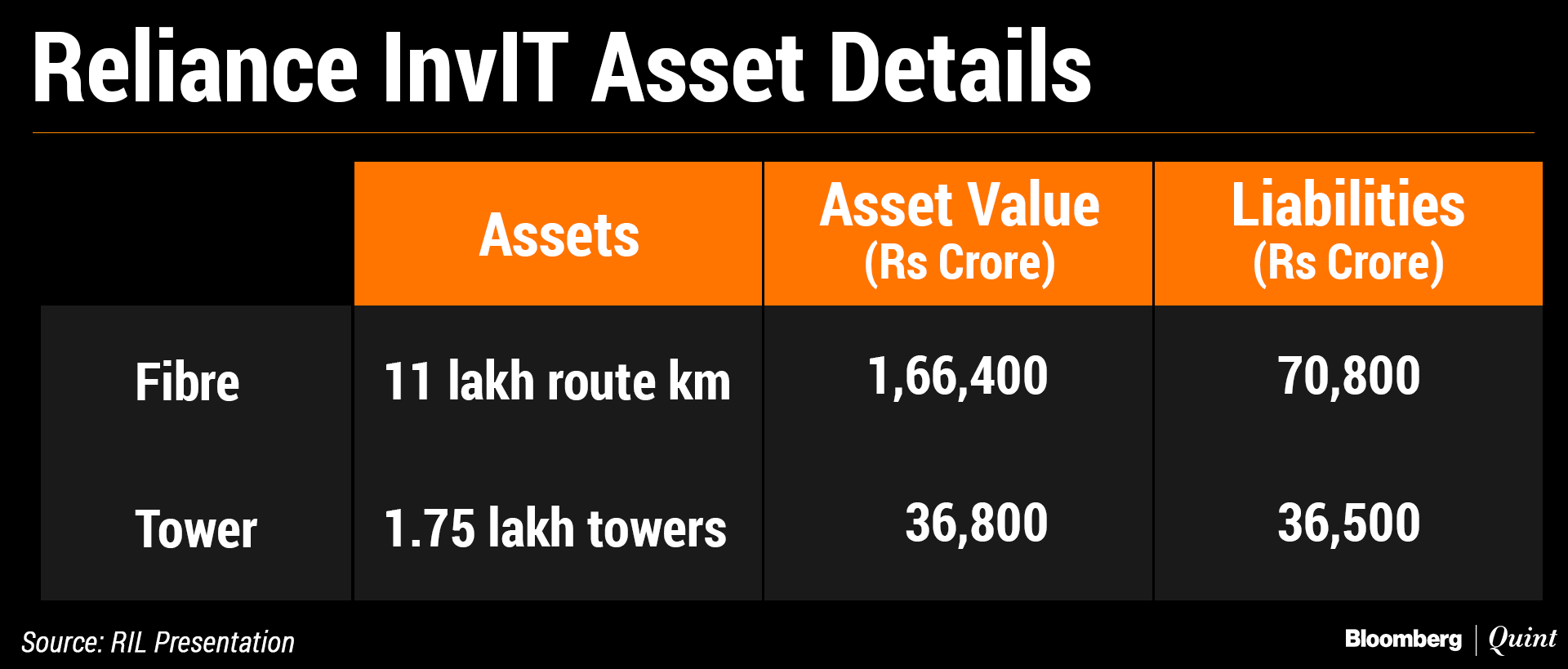 The numbers cropped up in a Reliance Industries Ltd. investor presentation. The country's second largest company by market capitalisation has decided to demerge the tower and fibre infrastructure of its telecom arm — Reliance Jio. The assets will be transferred to two special purpose vehicles — Jio Digital Fibre Pvt. Ltd. and Reliance Jio Infratel Pvt. Ltd., which will be controlled by an Investment Infrastructure Trust or InvIT.