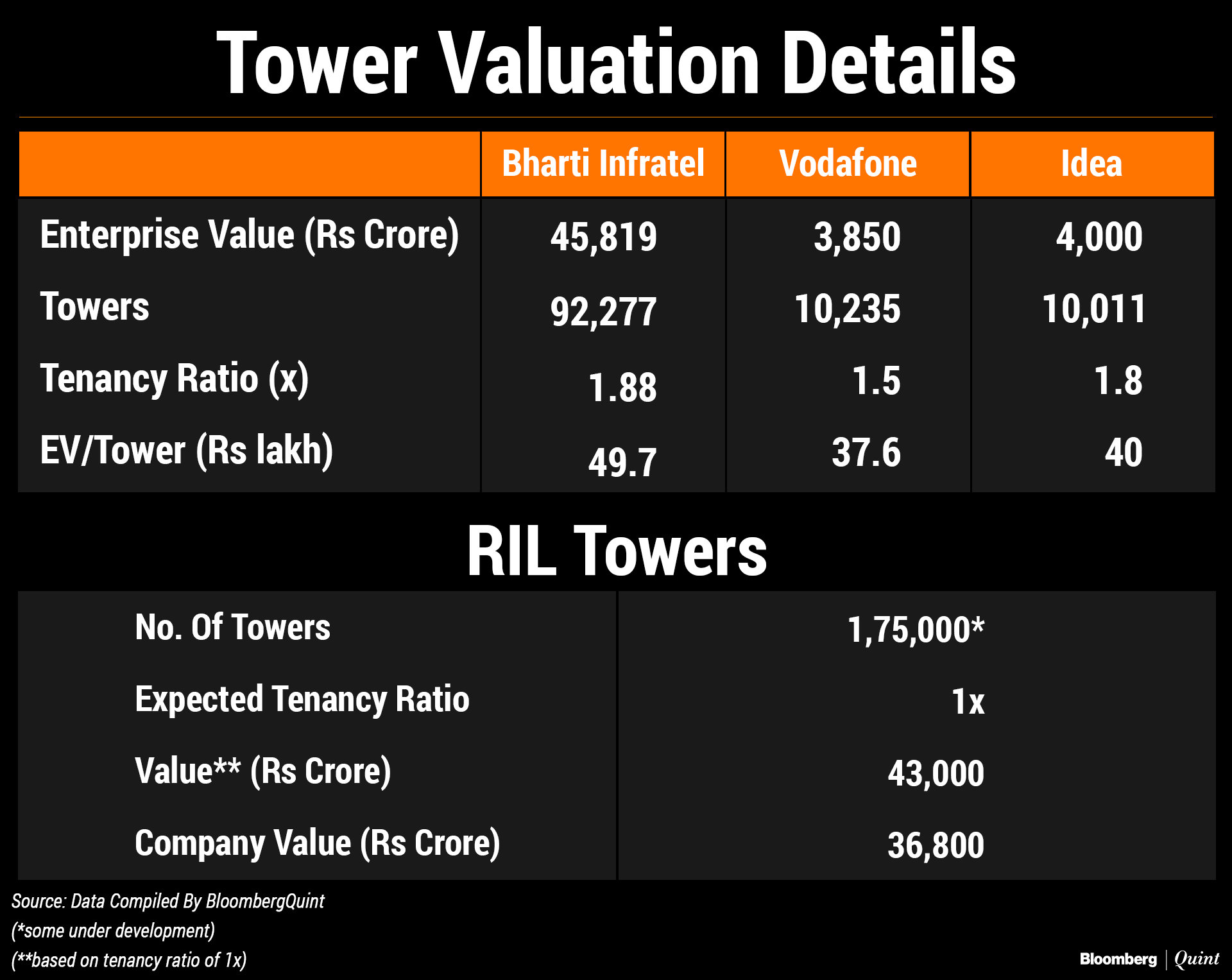Using the average of the three, the value of Reliance's 1.75 lakh towers adds up to Rs 43,000 crore. A tad higher than the company's own valuation of Rs 36,800. But remember, Reliance's towers have a tenancy ratio of one. So the valuation ought to be lower, some analysts say.