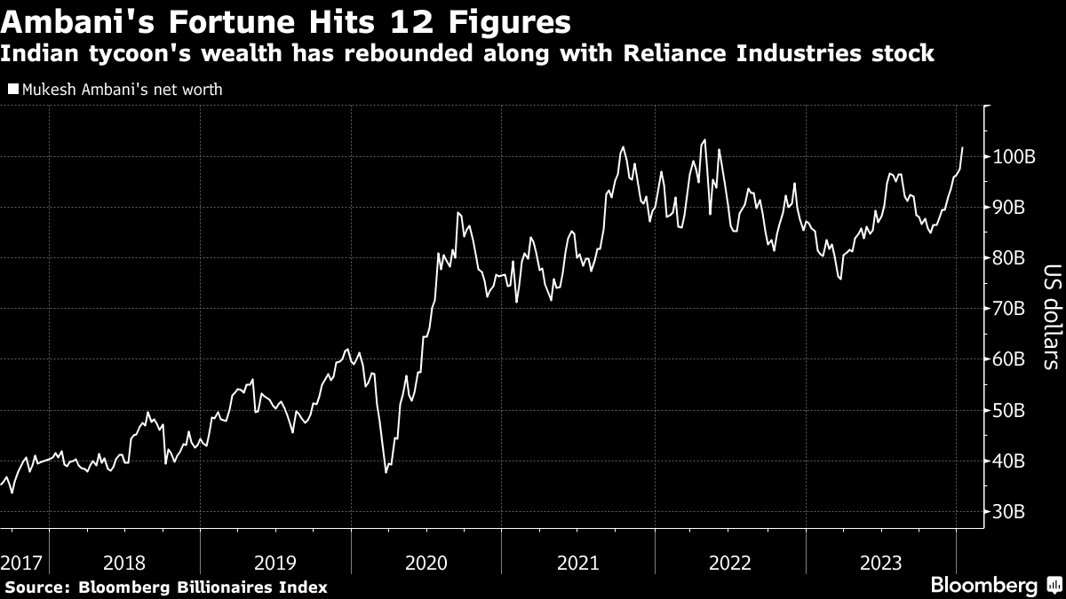 The richest person in India — and in Asia — saw his wealth climb $2.8 billion to $101.8 billion Thursday, as shares of his flagship, Reliance Industries Ltd., rose 2.6% to close at a record high. He's returning to the $100-billion club for the first time since June 2022, according to the Bloomberg Billionaires Index.