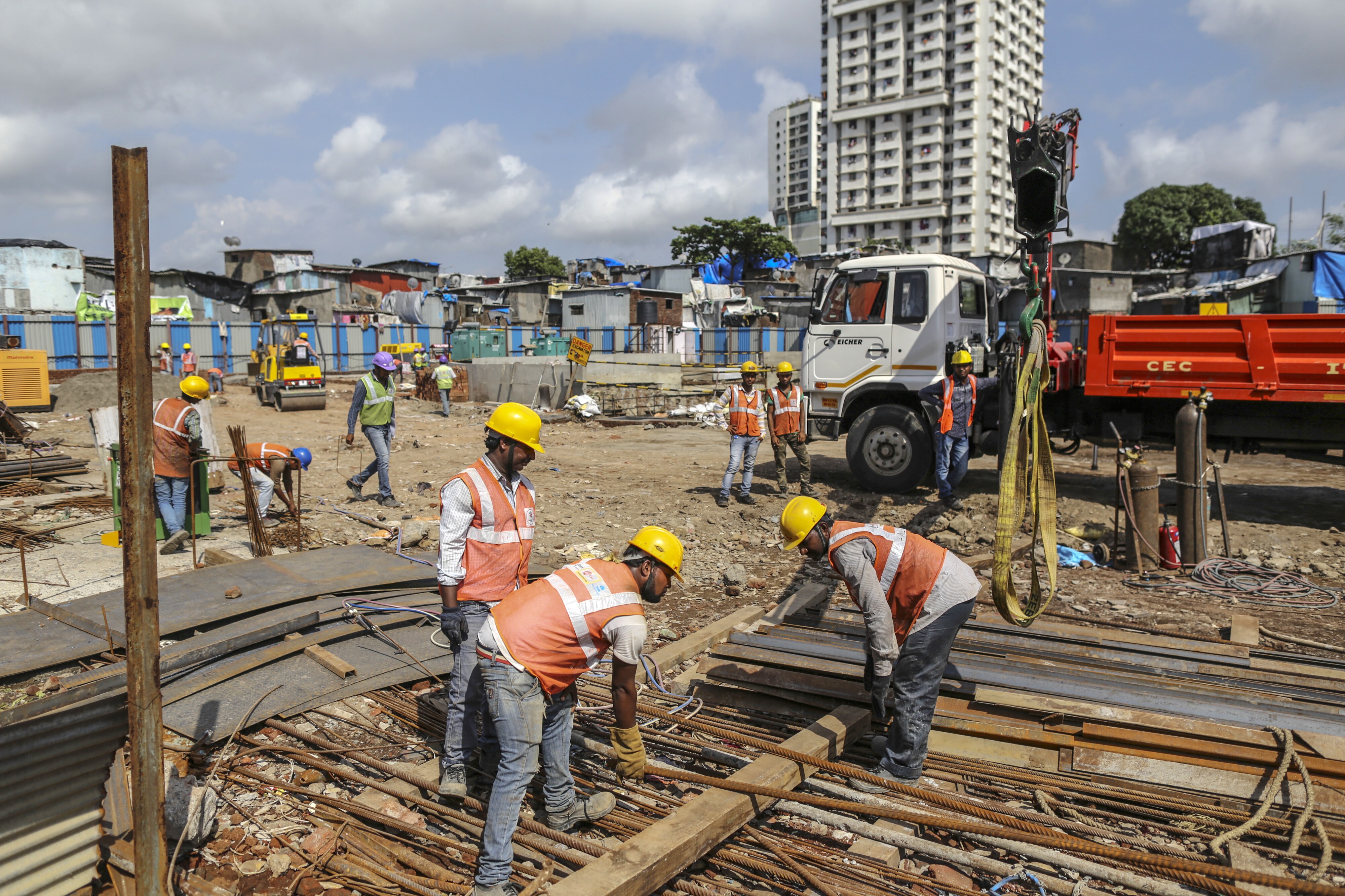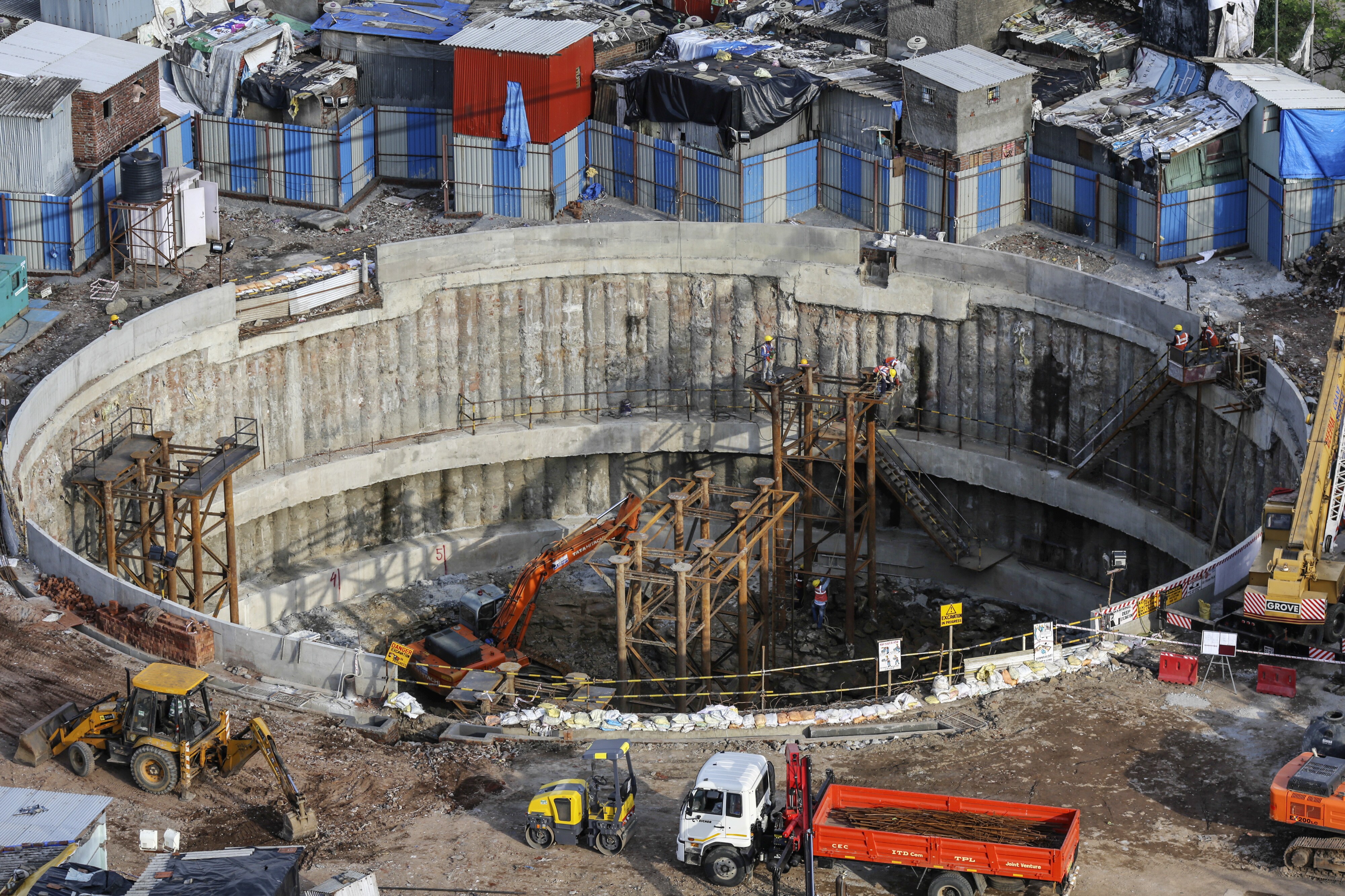 Workers labor at the excavation site of a launching shaft for Metro Line 3, operated by the Mumbai Metro Rail Corp. (MMRC), in the Dharavi area of Mumbai. (Photographer: Dhiraj Singh/Bloomberg)
