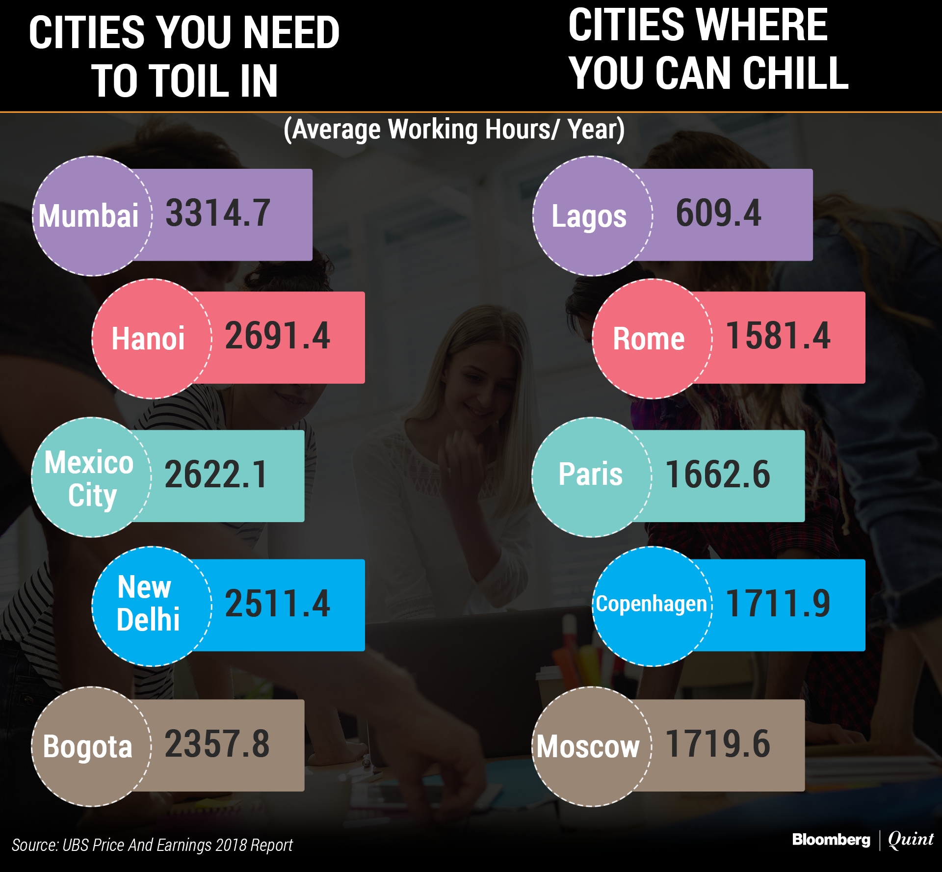 It turns out that employees in Mumbai, Hanoi, Mexico City, New Delhi and Bogota worked the most number of hours in a year. In comparison, employees in cities like Helsinki, Moscow, Copenhagen, Paris, Rome and Lagos worked the fewest hours.