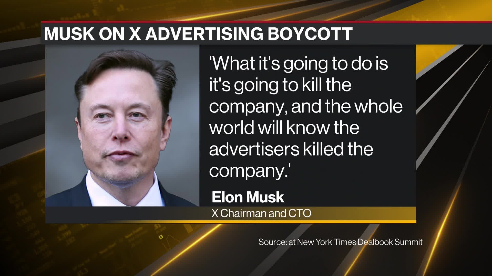 “What it's going to do is it's going to kill the company, and the whole world will know the advertisers killed the company,” Musk said at the New York Times DealBook conference on Wednesday. “Go f—- yourself.”