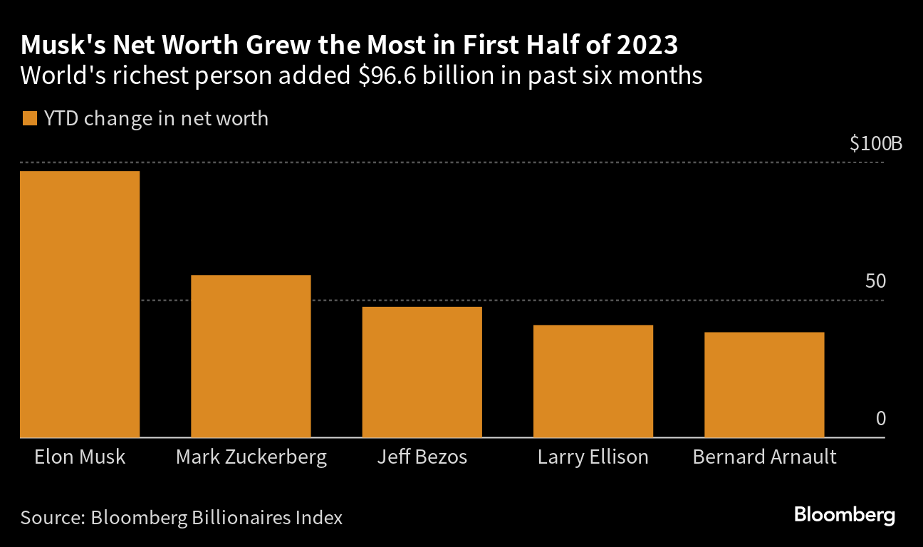 While Elon Musk and Mark Zuckerberg flirt with scheduling a cage match, Tesla Inc.'s chief executive officer came out on top in dollar terms. Musk, the world's richest person, added $96.6 billion to his net worth this year through June 30, while Meta Platforms Inc. CEO Zuckerberg gained $58.9 billion.