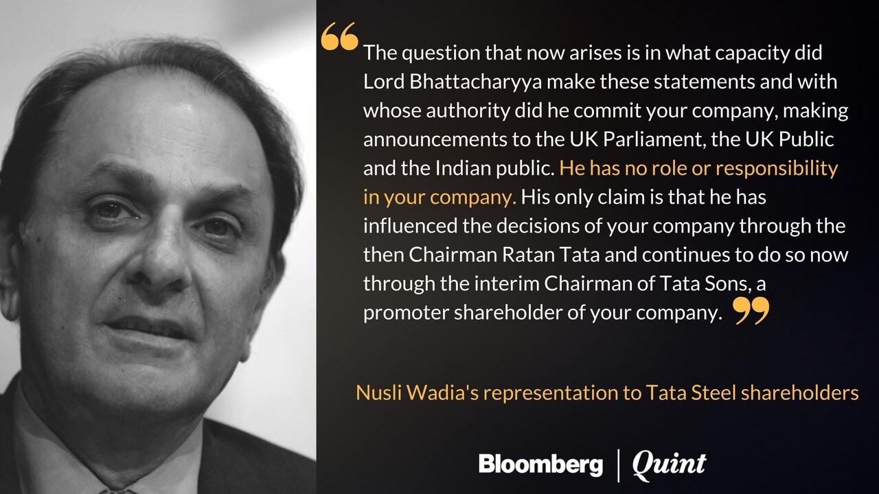 Wadia questioned Kumar Bhattacharya's authority to make a commitment on behalf of Tata Steel to the British Parliament. Bhattacharya who doesn't hold any official position in the company is said to have committed to “Tata Steel's continued steelmaking in Britain for at least a decade”.