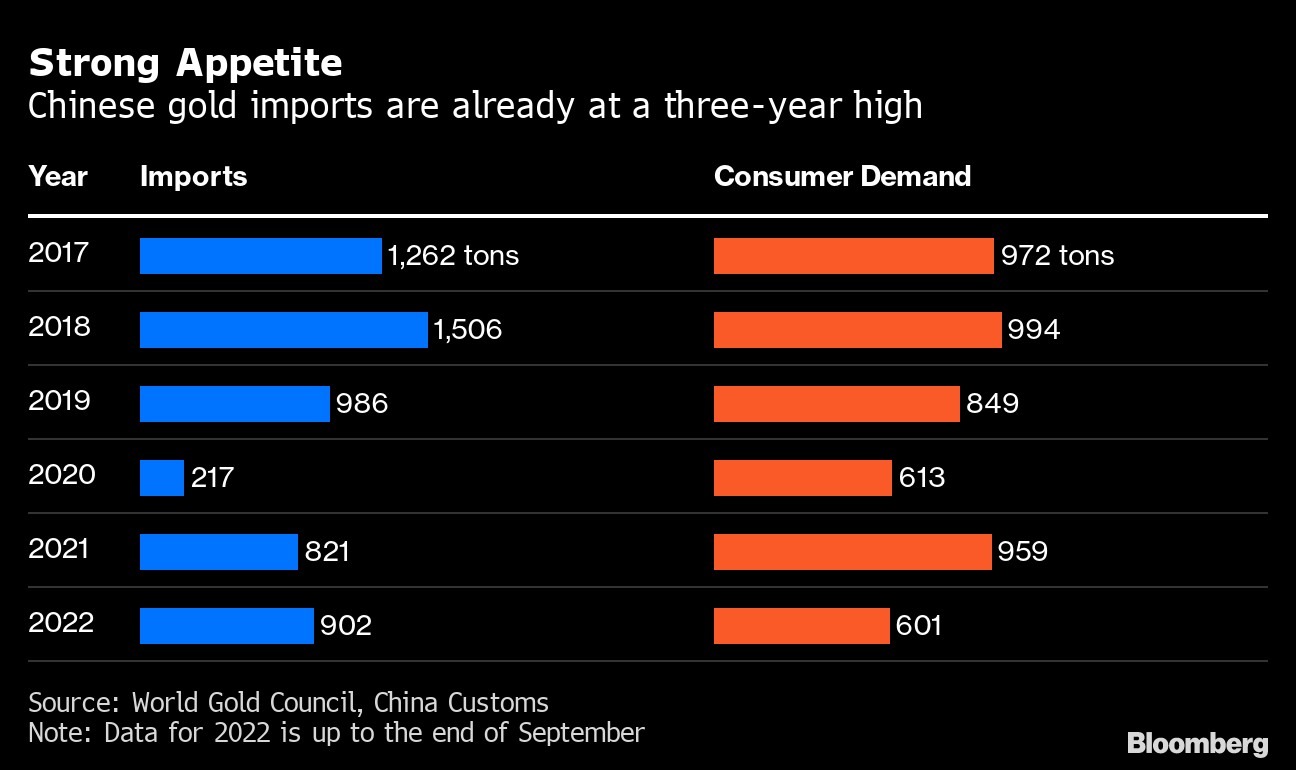 And while domestic demand has been strong, with citizens buying some 601 tons through the third quarter, it's on track to fall short of 2021 levels. Earlier in the year, Covid-19 lockdowns hampered purchases of jewelry and bullion in one of the world's top consumers.