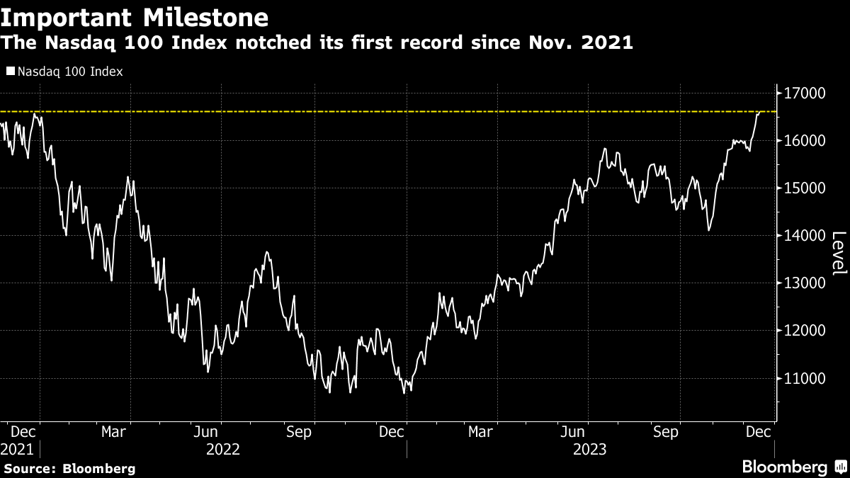 (Bloomberg) -- The Nasdaq 100 Index hit a new all-time high Friday as big tech stocks rally after the Federal Reserve signaled that its aggressive rate-hikes to contain inflation are over and cuts are on the table for 2024.