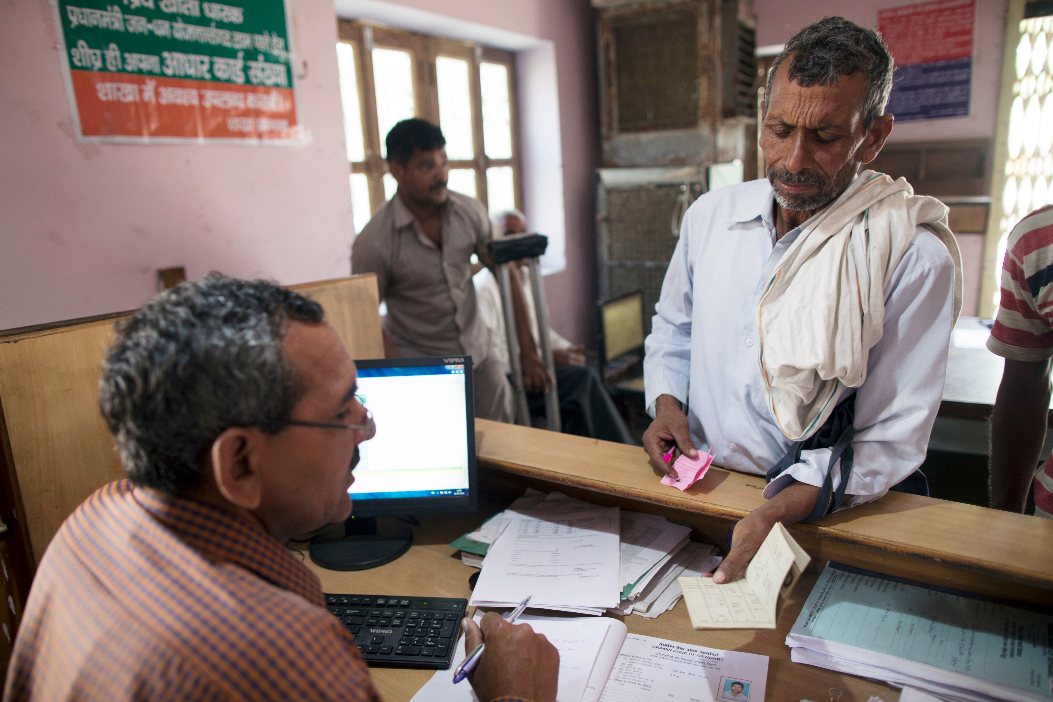 An employee serves a customer inside a bank in India. (Photographer: Prashanth Vishwanathan/Bloomberg)