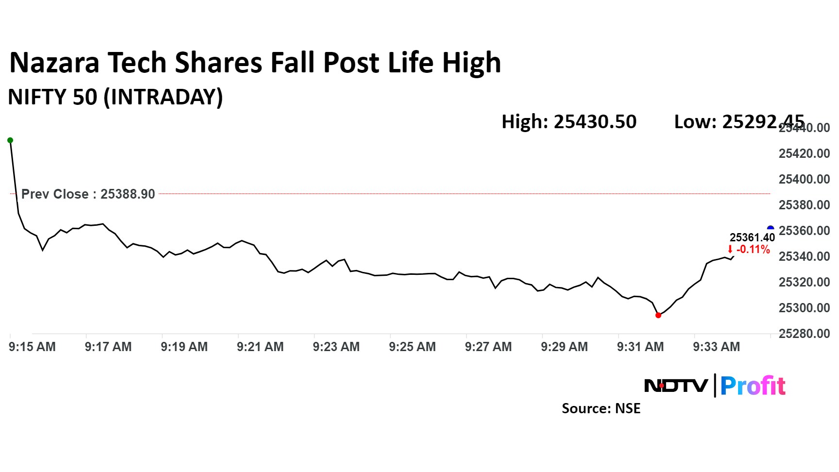 Shares of Nazara Technologies Ltd. rose as much as 4.03%, to hit its highest ever level, before erasing gains to trade 0.91% lower at Rs 999.90 apiece, as of 09:31a.m. This compares to a 0.26 decline in the NSE Nifty 50.
