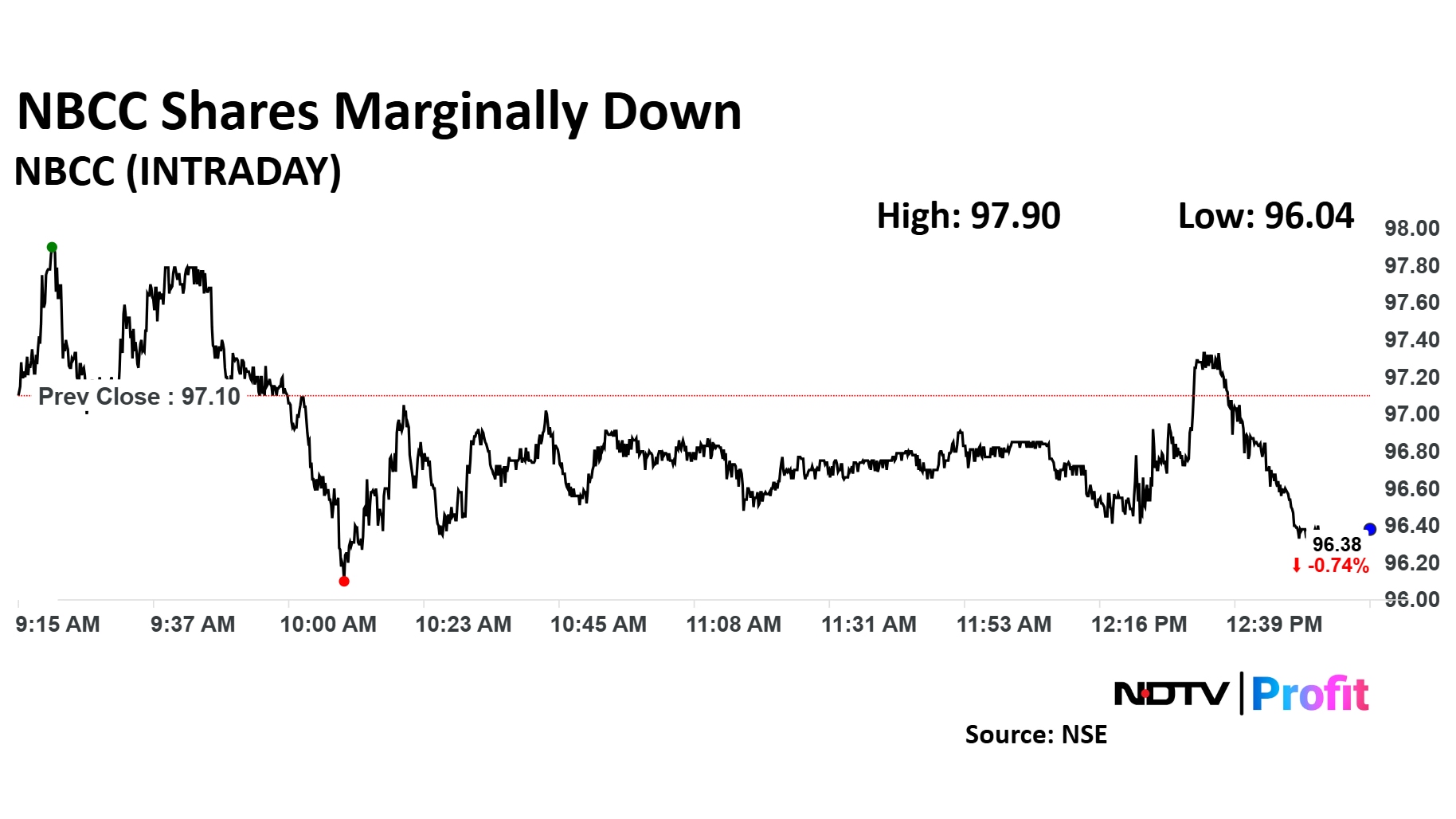 Shares of NBCC fell as much as 1.09% to Rs 96.04 apiece, the highest level since Nov. 27, 2024. It pared losses to trade 0.88% lower at Rs 96.25 apiece, as of 12:54 p.m. This compares to a 0.8% decline in the NSE Nifty 50.