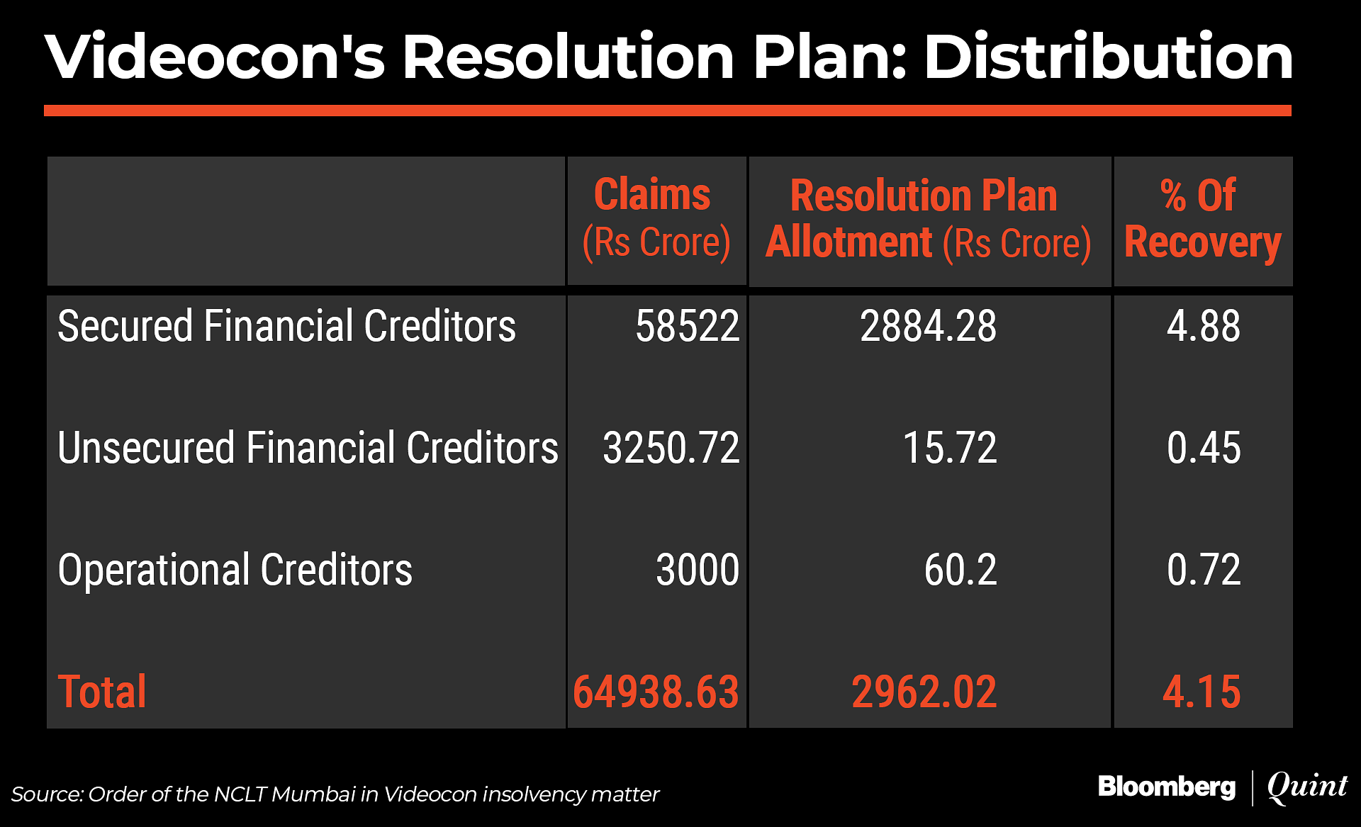 The resolution plan had raised eyebrows as financial creditors to Videocon Industries were set to recover only about Rs 2,900 crore compared to Rs 61,000 crore in dues. This worked out to a recovery rate of just about 5%.