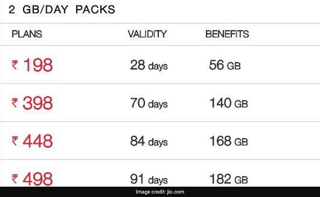 Reliance Jio offers four recharge plans that offer 2 GBs of high speed data per day for a validity period ranging from 28 days to 91 days.