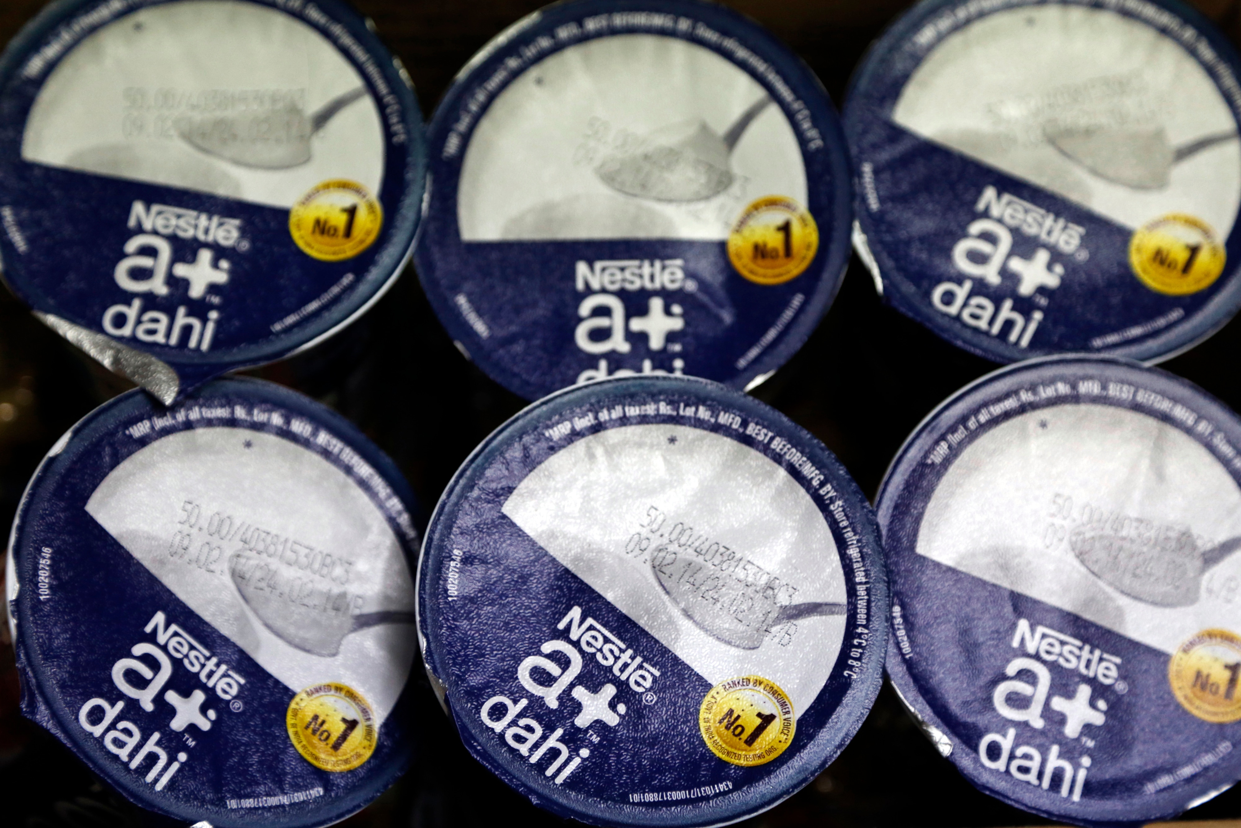 Tubs of Nestle A+ Dahi, a Yoghurt Produced by Nestle India (Photographer: Vivek Prakash/Bloomberg)