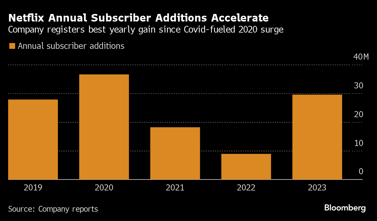 (Bloomberg) -- Netflix Inc. signed up 13.1 million customers in the final three months of 2023, the streaming giant's best quarter of growth since viewers were stuck at home in the early days of the pandemic.