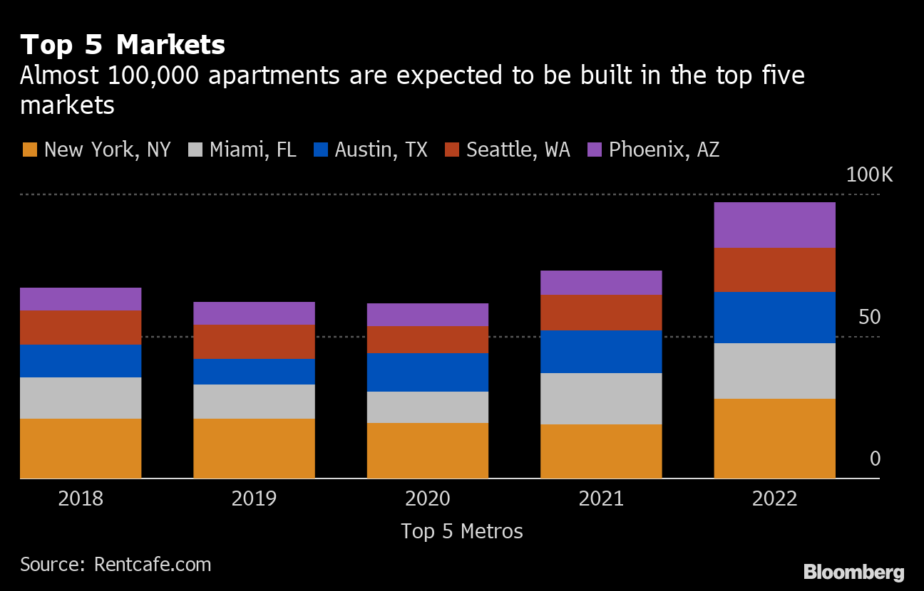 Overall, five cities account for almost a quarter of all new apartments expected this year, according to RentCafe.