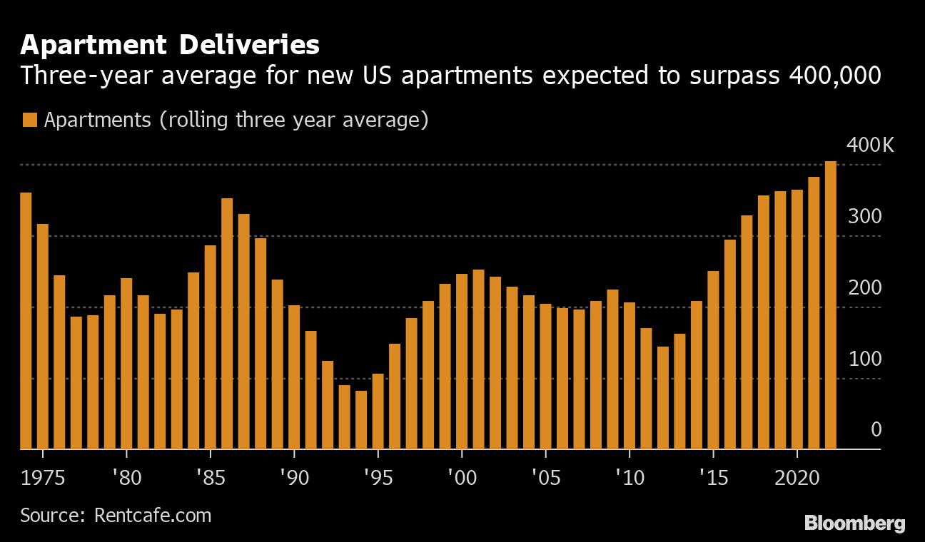 A jump in apartment construction in the US may help provide some relief to renters who've faced soaring prices -- eventually.