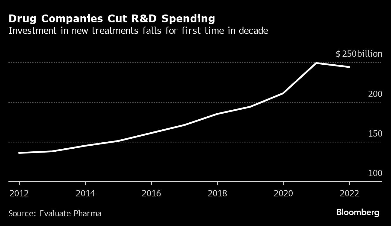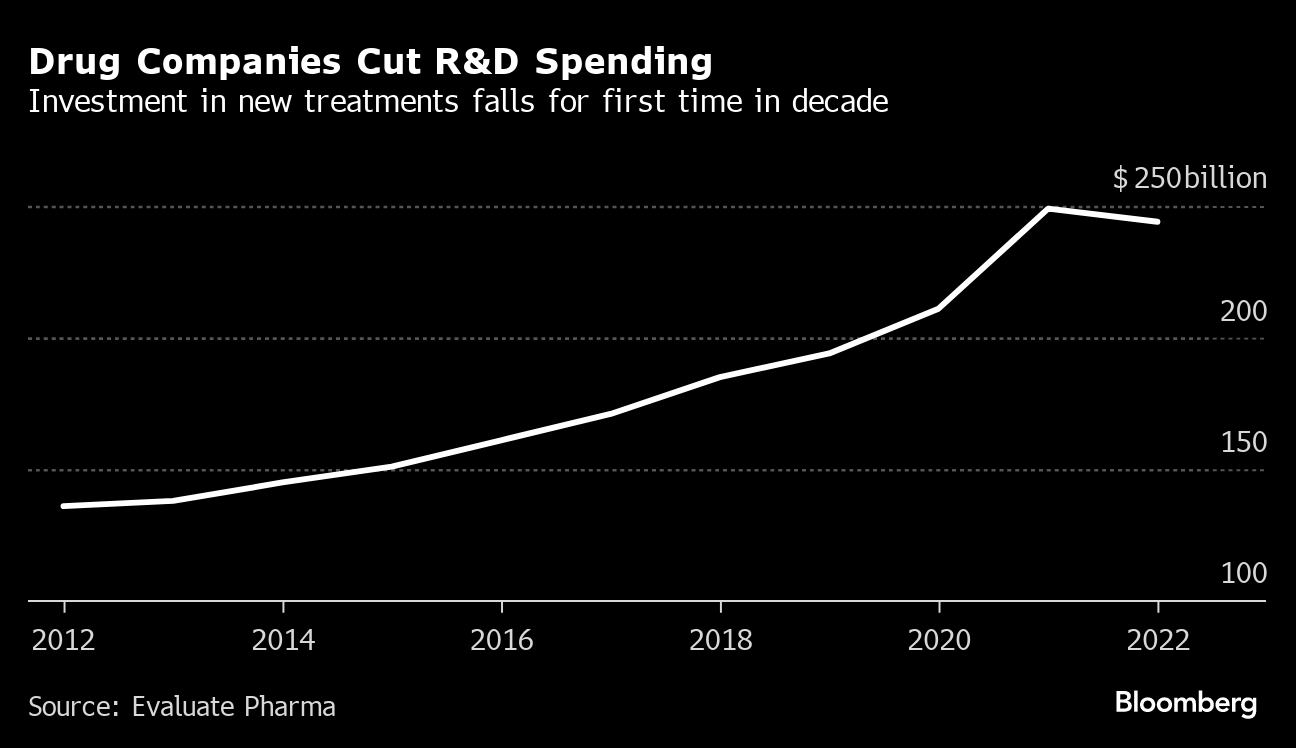 Last year, global pharma R&D spending fell 2.2% to $244 billion, the first drop in a decade, according to Evaluate Pharma, and slowed growth is expected in the coming years. It was just the fourth such decline in almost four decades, according to the PhRMA industry group.