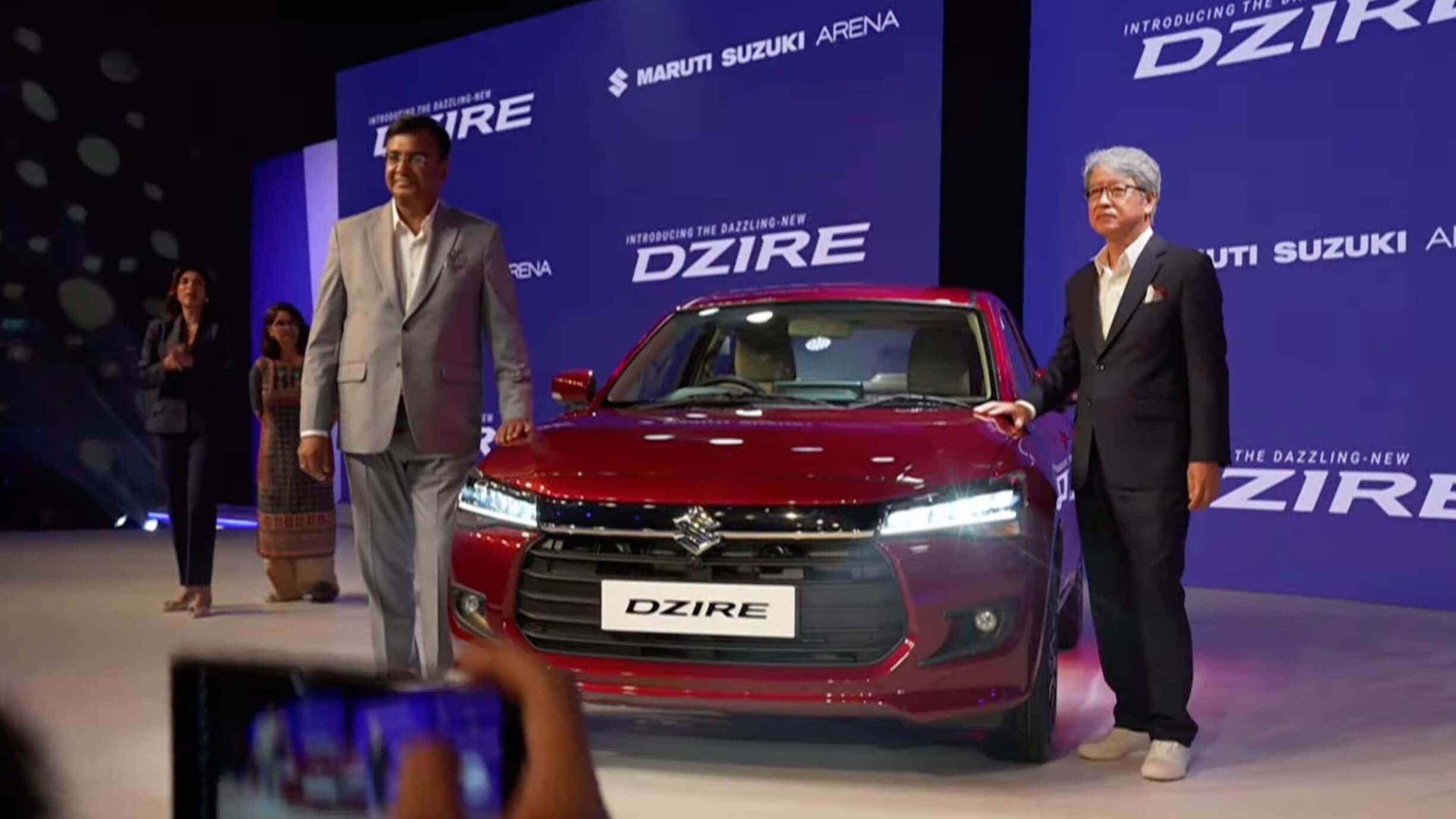 Partho Banerjee, senior executive officer - sales & marketing at Maruti Suzuki, and CEO Hisashi Takeuchi at the launch of the new Dzire in New Delhi on Monday, 11 November 2024. (Photo: YouTube)